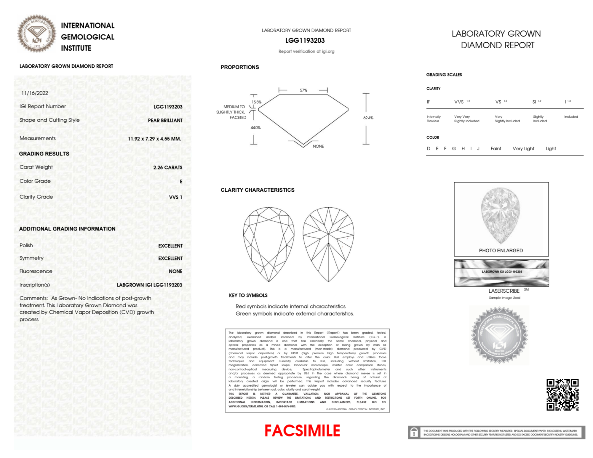 Your 2.26 carat Pear lab diamond is graded E color (Colorless), and you can read more about E color diamonds here.