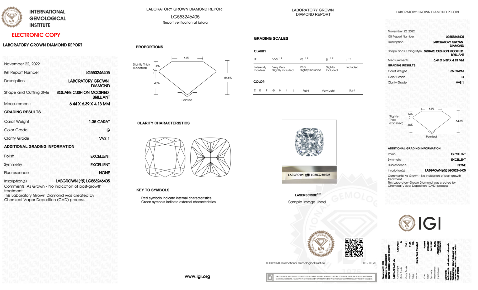 Your 1.35 carat Cushion lab diamond is graded G color (Near Colorless), and you can read more about G color diamonds here.