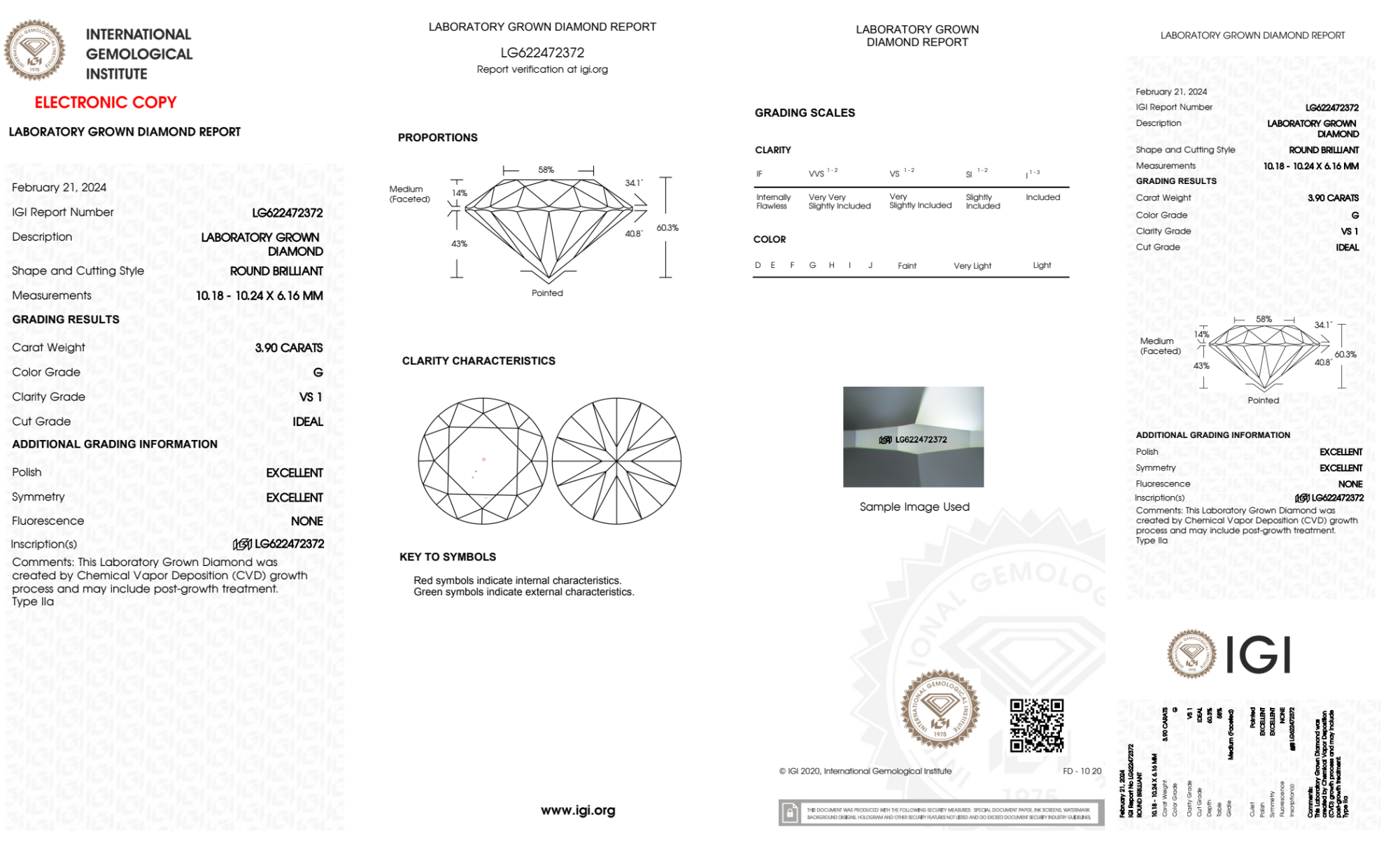 Your 3.90 carat Round lab diamond is graded G color (Near Colorless), and you can read more about G color diamonds here.