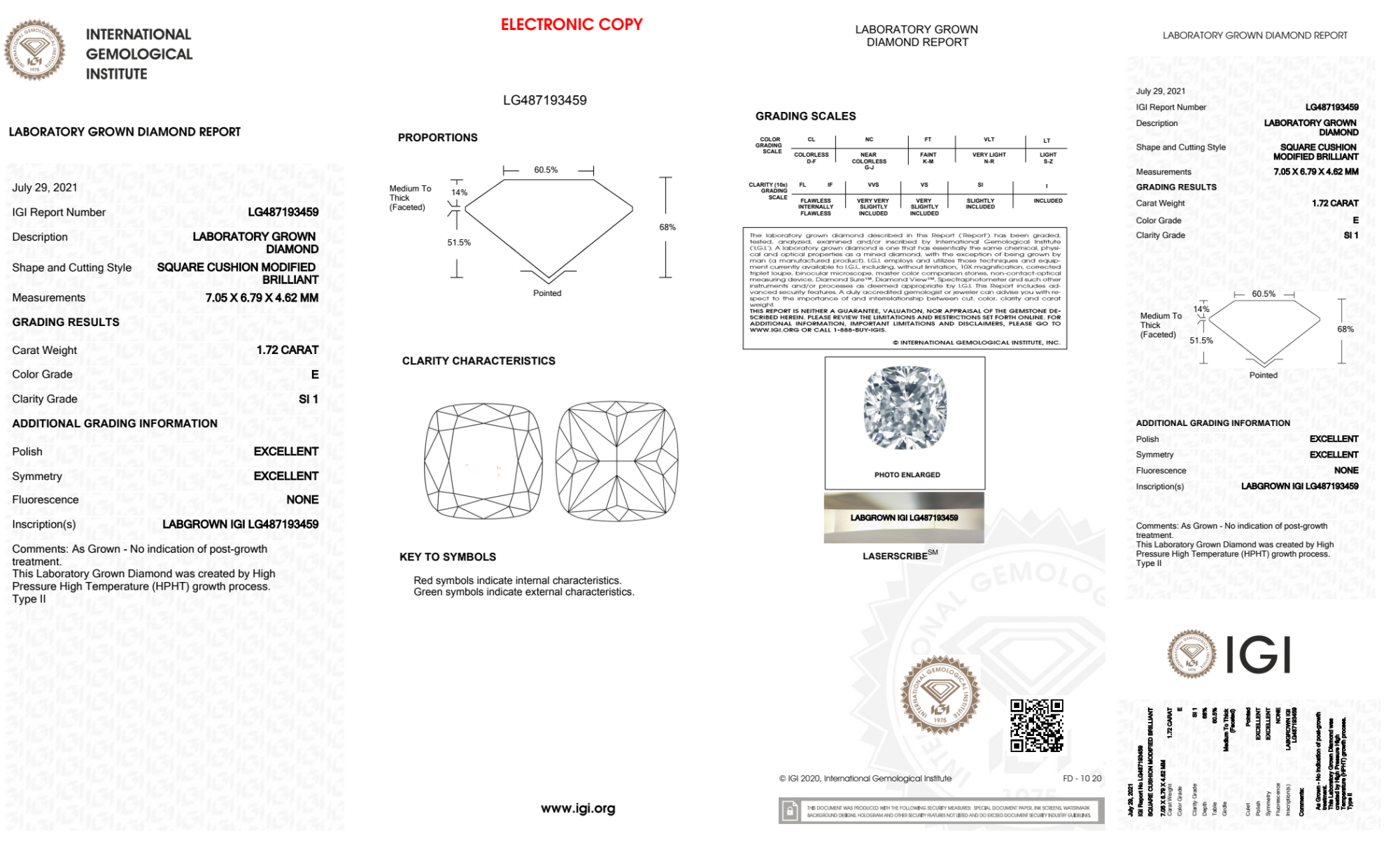 Your 1.72 carat Cushion lab diamond is graded E color (Colorless), and you can read more about E color diamonds here.