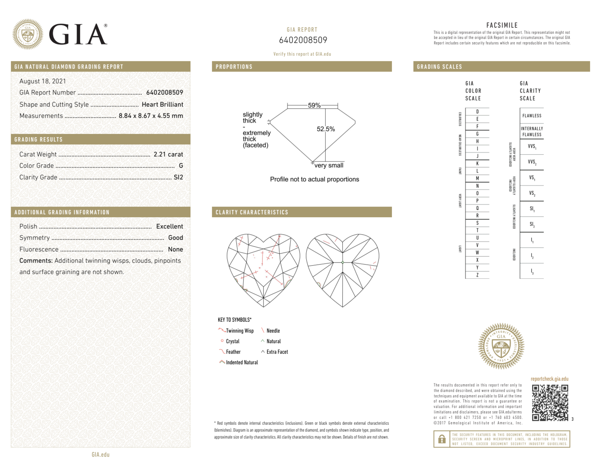 Your 2.21 carat Heart natural diamond is graded SI2 clarity, which stands for Slightly Included 2. Read more about SI2 clarity diamonds here, or learn more about diamond clarity in general here.