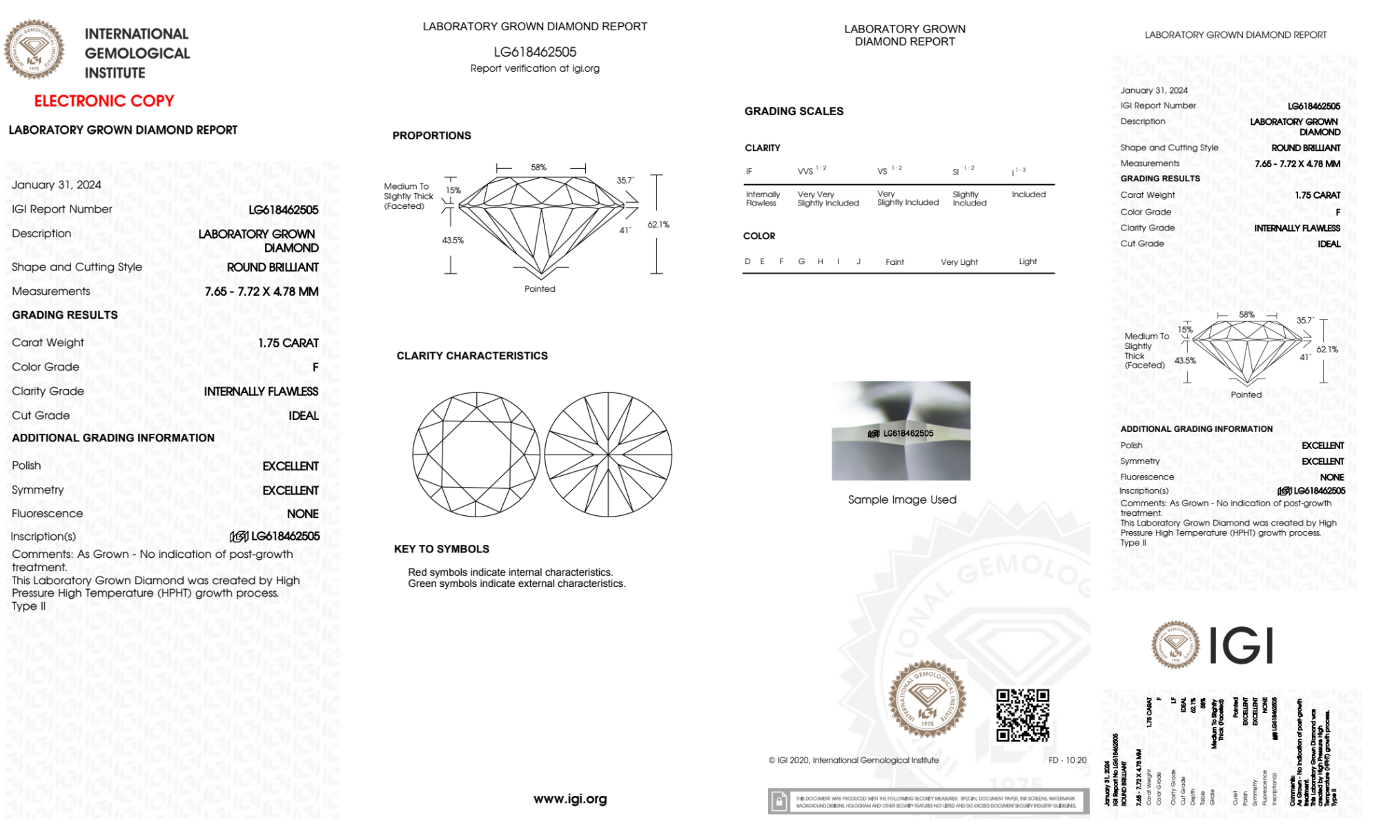 Your 1.75 carat Round lab diamond is graded IF clarity, which stands for Internally Flawless. Read more about IF clarity diamonds here, or learn more about diamond clarity in general here.