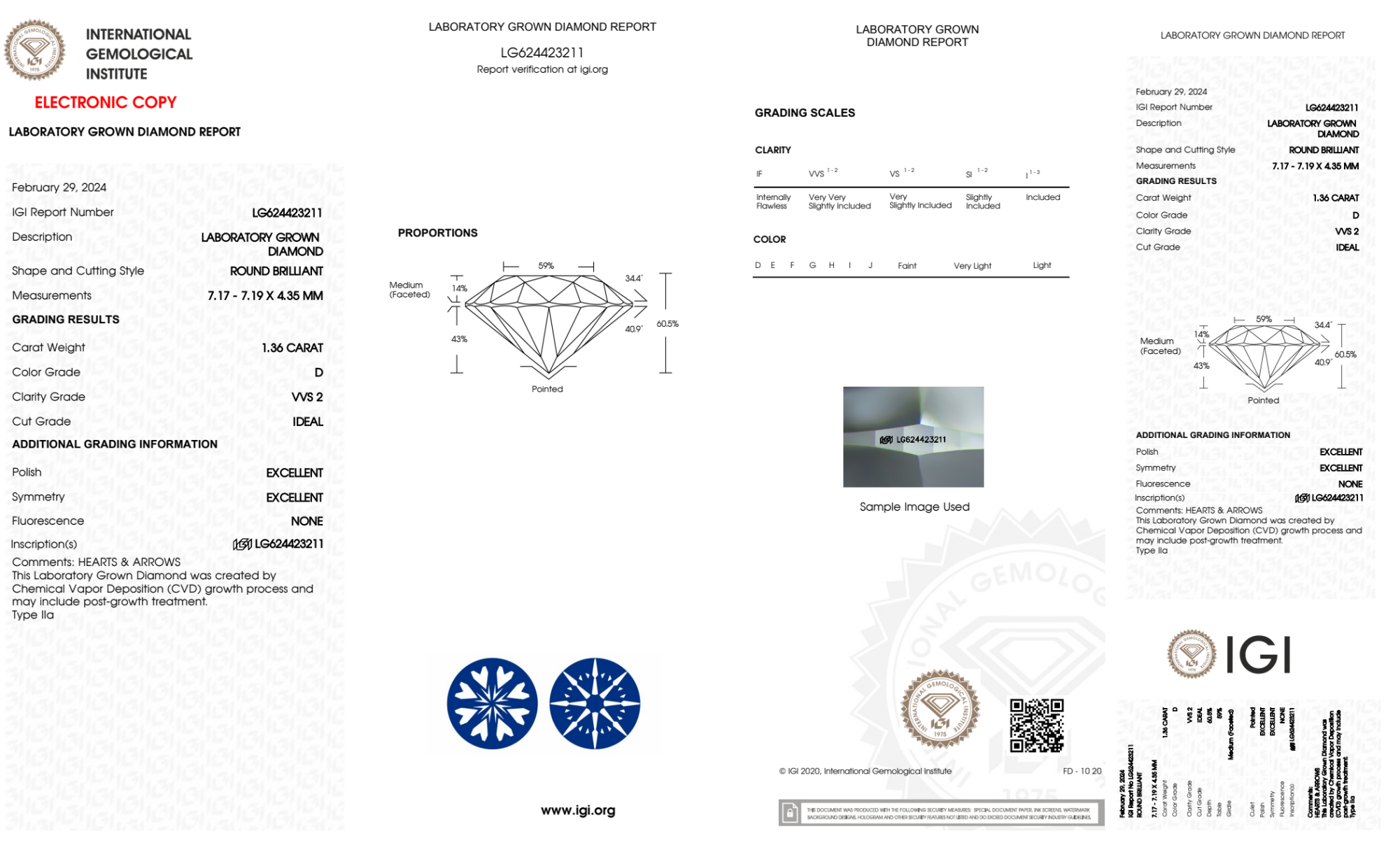 Your 1.36 carat Round lab diamond is graded D color (Colorless), and you can read more about D color diamonds here.