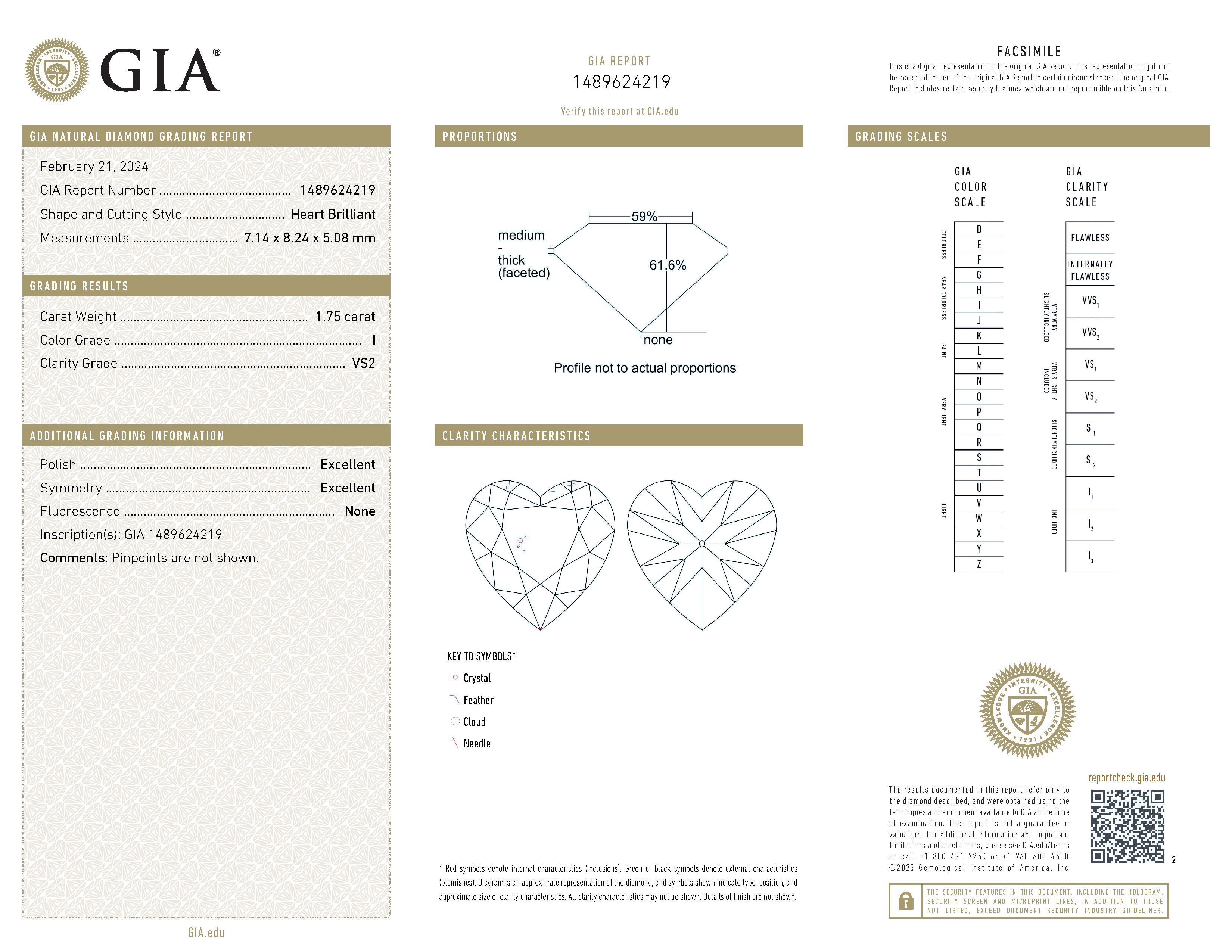 Your 1.75 carat Heart natural diamond is graded VS2 clarity, which stands for Very Slightly Included 2. Read more about VS2 clarity diamonds here, or learn more about diamond clarity in general here.