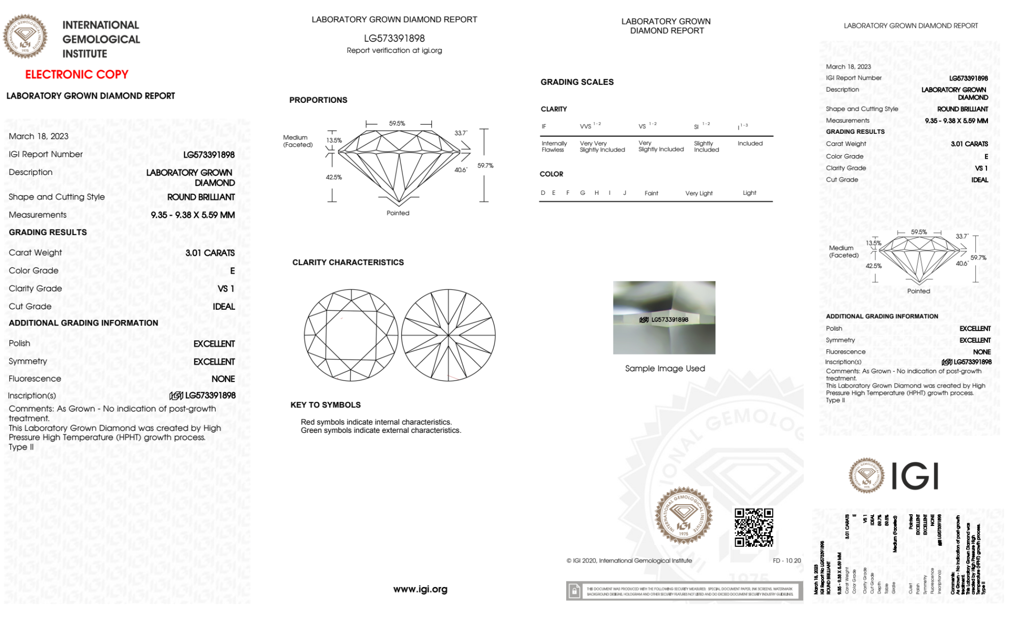 Your 3.01 carat Round lab diamond is graded E color (Colorless), and you can read more about E color diamonds here.