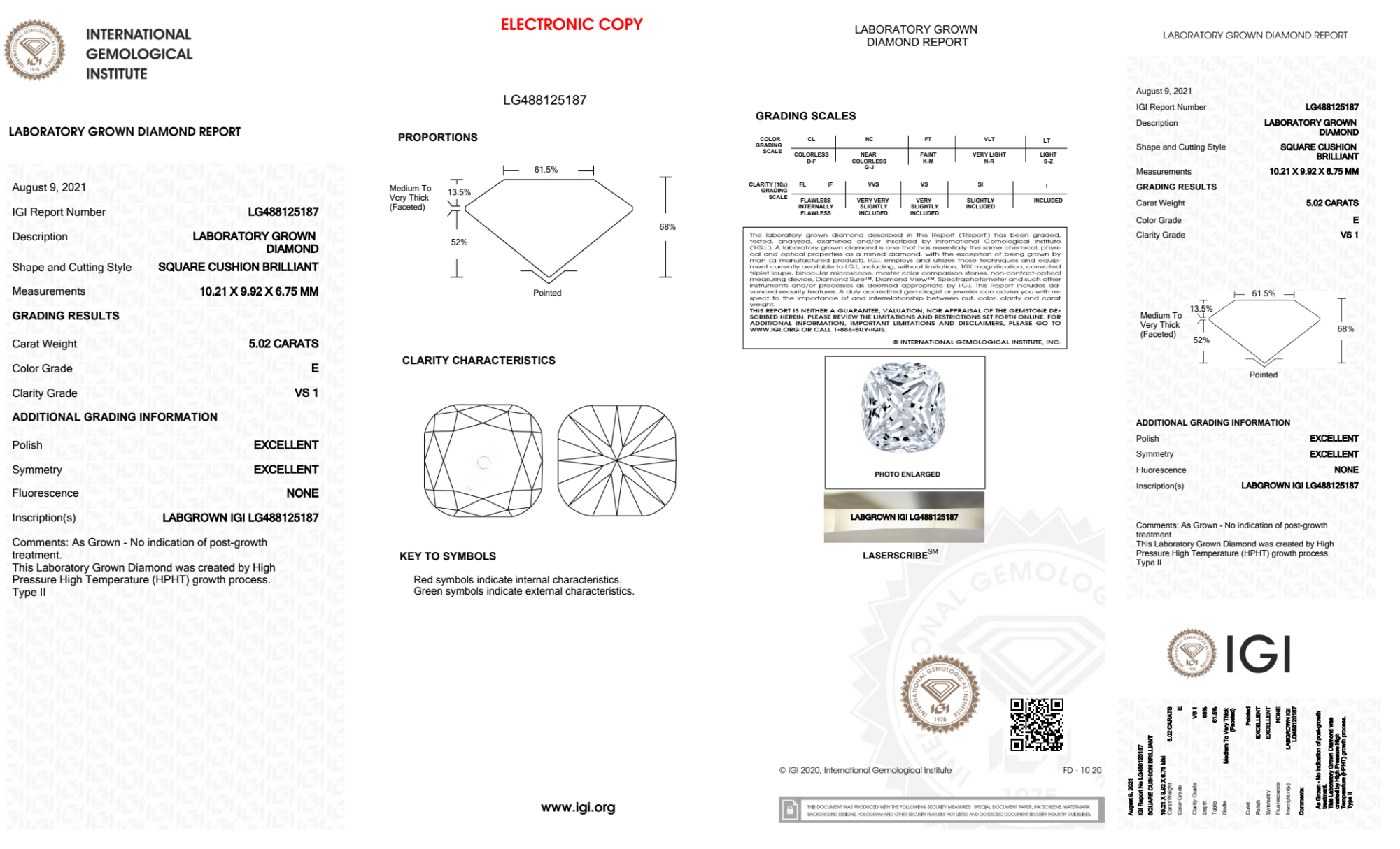 Your 5.02 carat Cushion lab diamond is graded E color (Colorless), and you can read more about E color diamonds here.