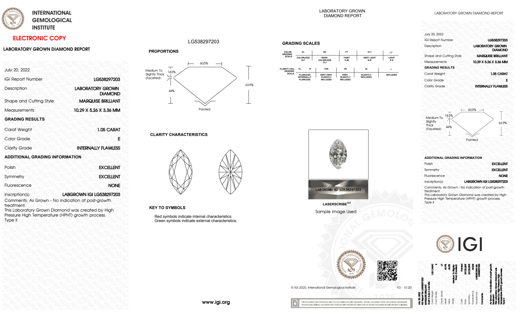 Your 1.05 carat Marquise lab diamond is graded E color (Colorless), and you can read more about E color diamonds here.