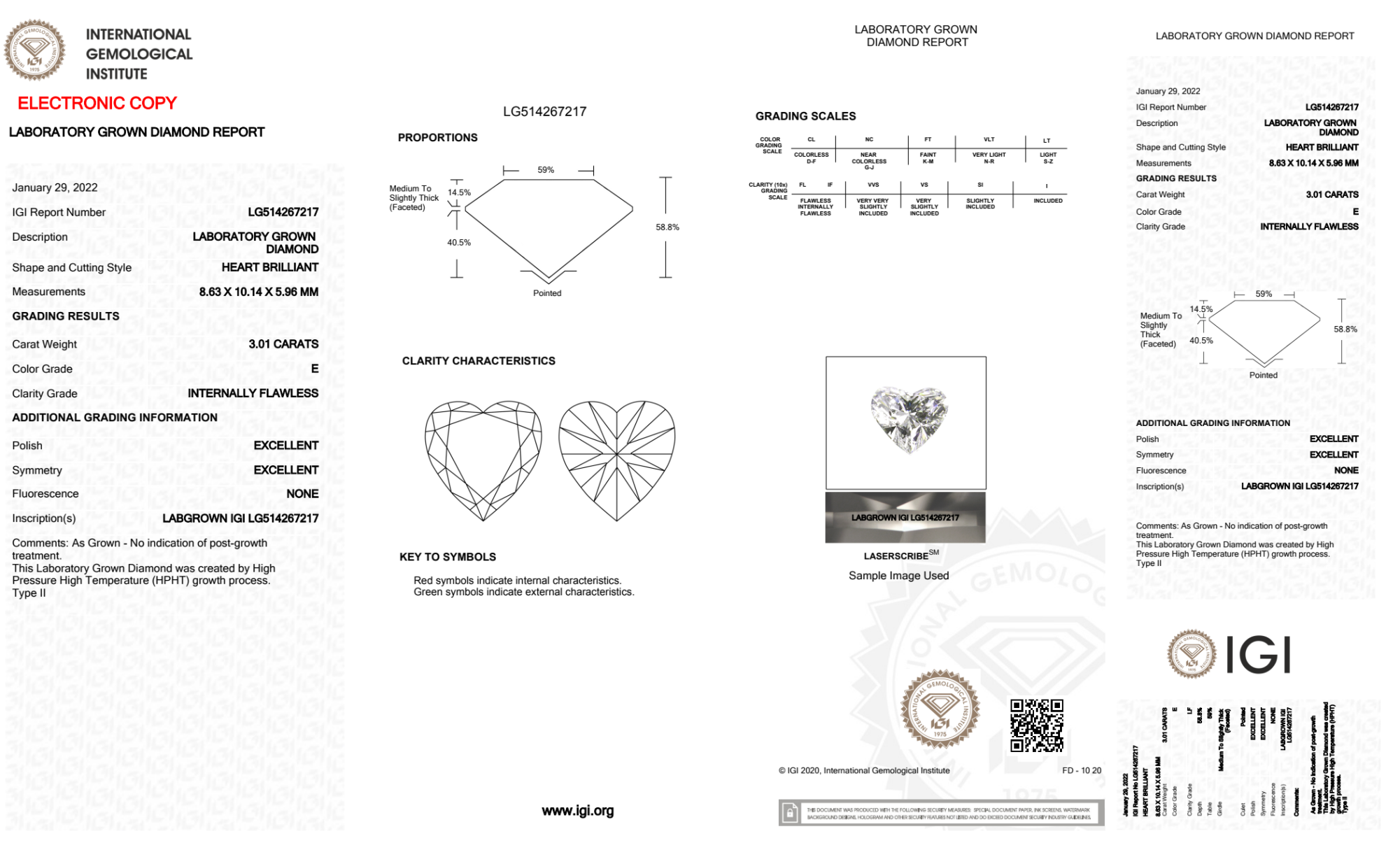 Your 3.01 carat Heart lab diamond is graded IF clarity, which stands for Internally Flawless. Read more about IF clarity diamonds here, or learn more about diamond clarity in general here.