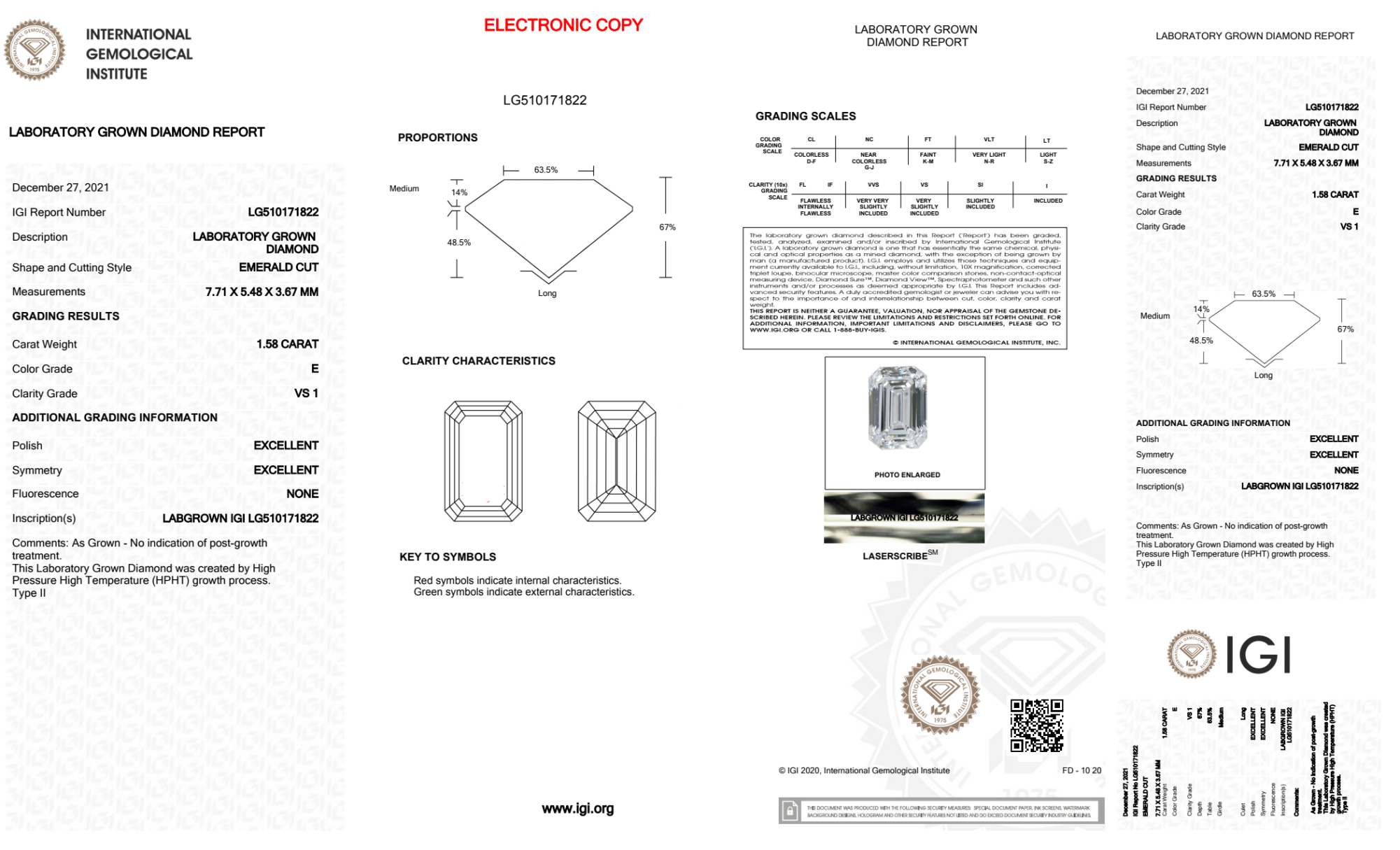 Your 1.58 carat Emerald lab diamond is graded E color (Colorless), and you can read more about E color diamonds here.