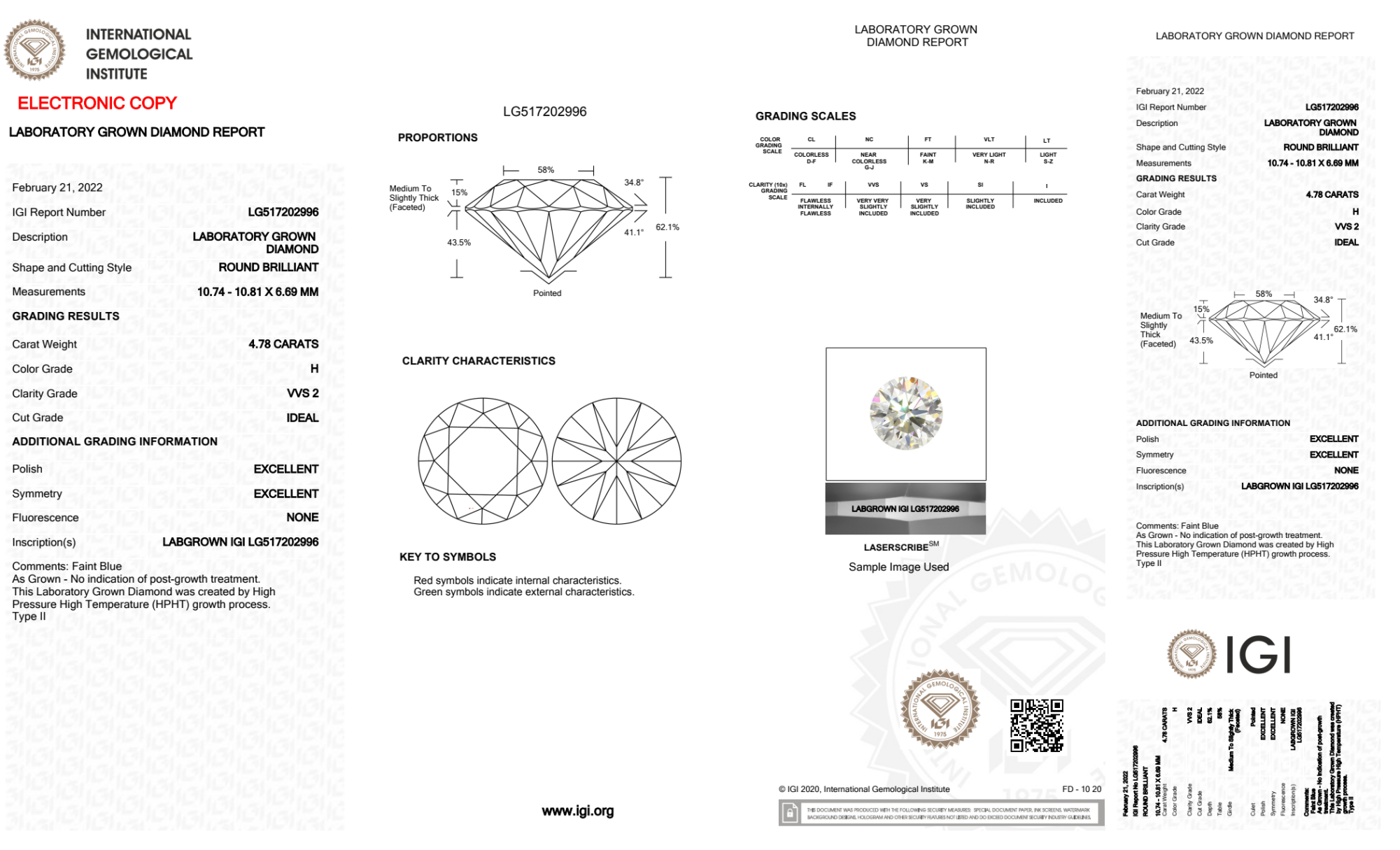 Your 4.78 carat Round lab diamond is graded H color (Near Colorless), and you can read more about H color diamonds here.