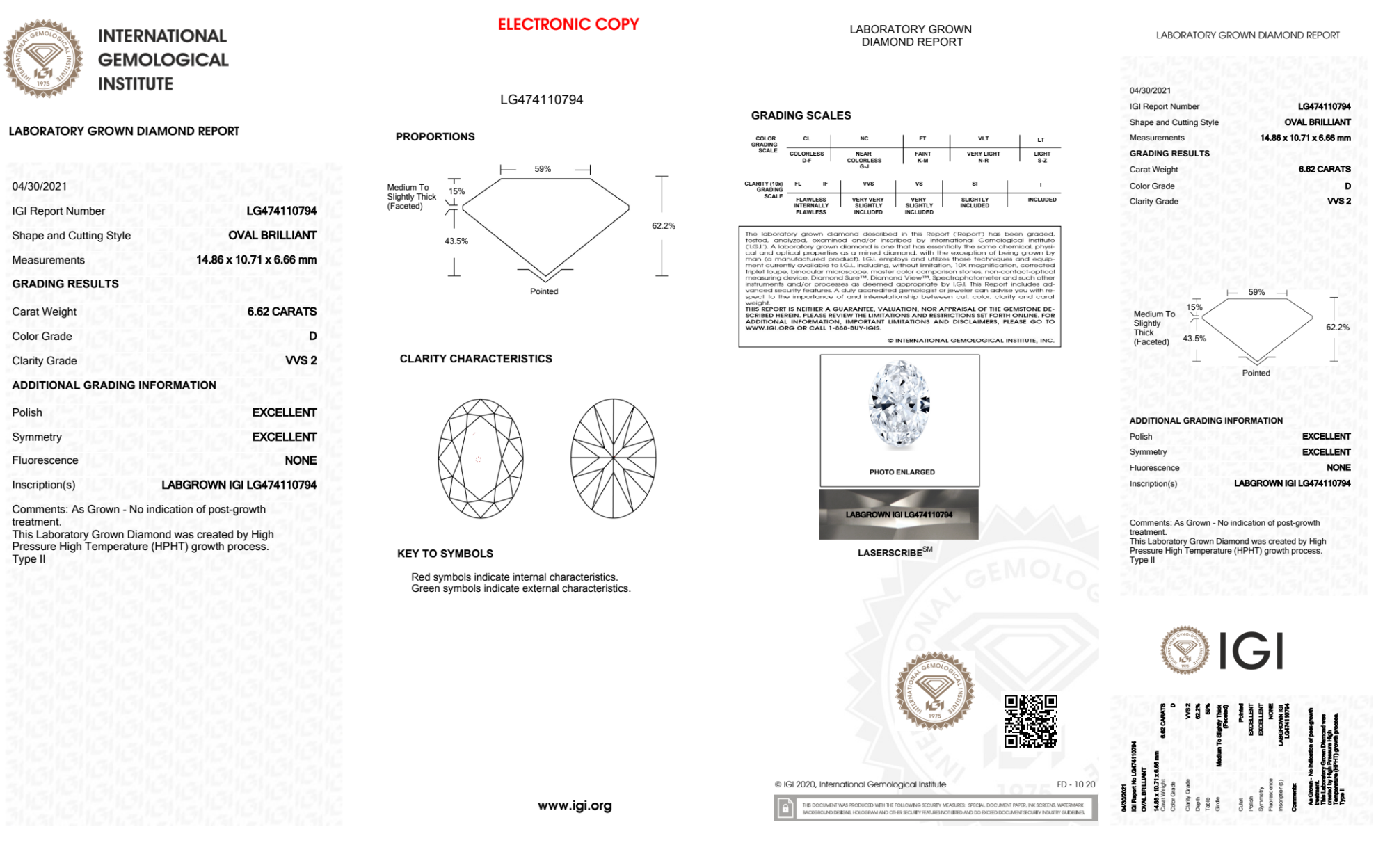 Your 6.62 carat Oval lab diamond is graded D color (Colorless), and you can read more about D color diamonds here.