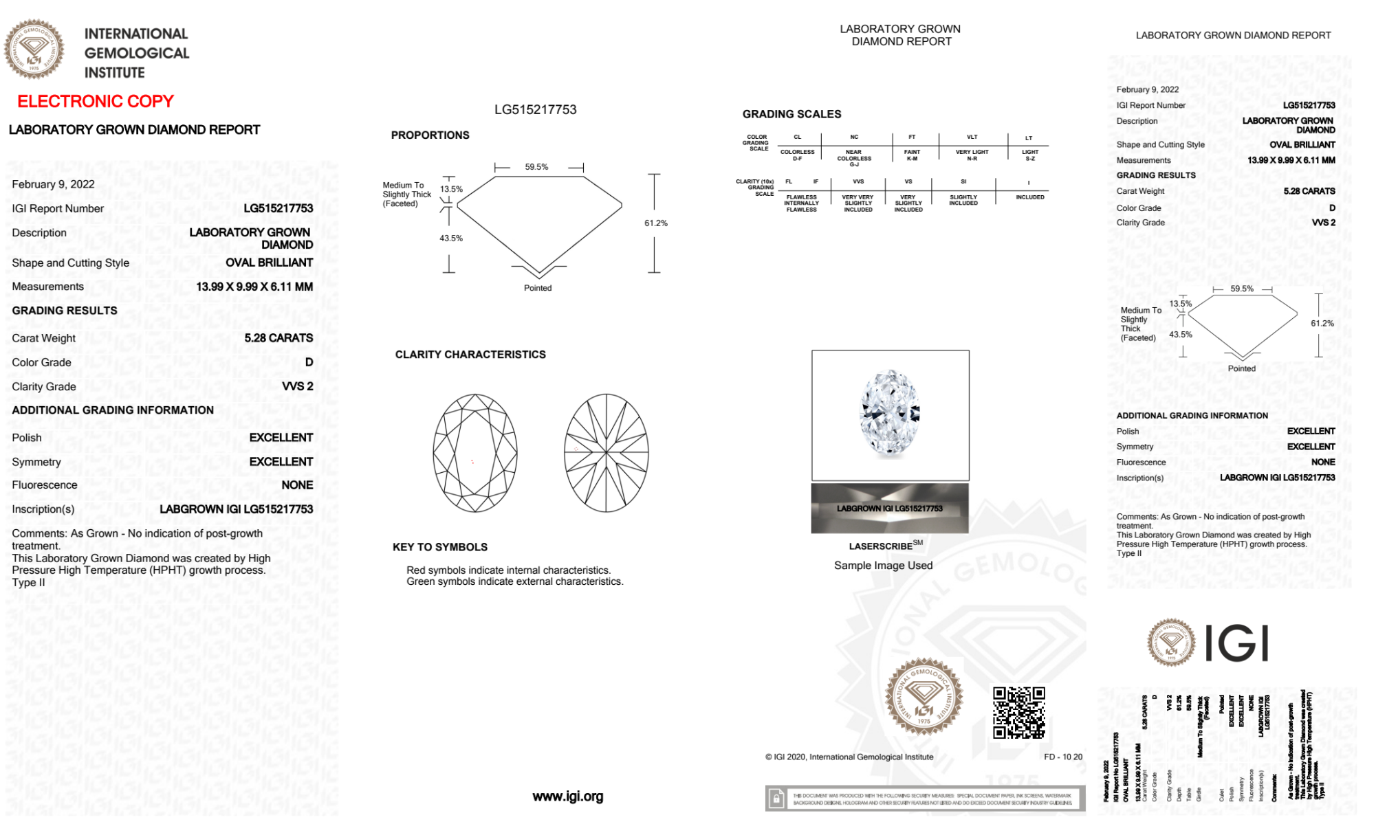 Your 5.28 carat Oval lab diamond is graded D color (Colorless), and you can read more about D color diamonds here.