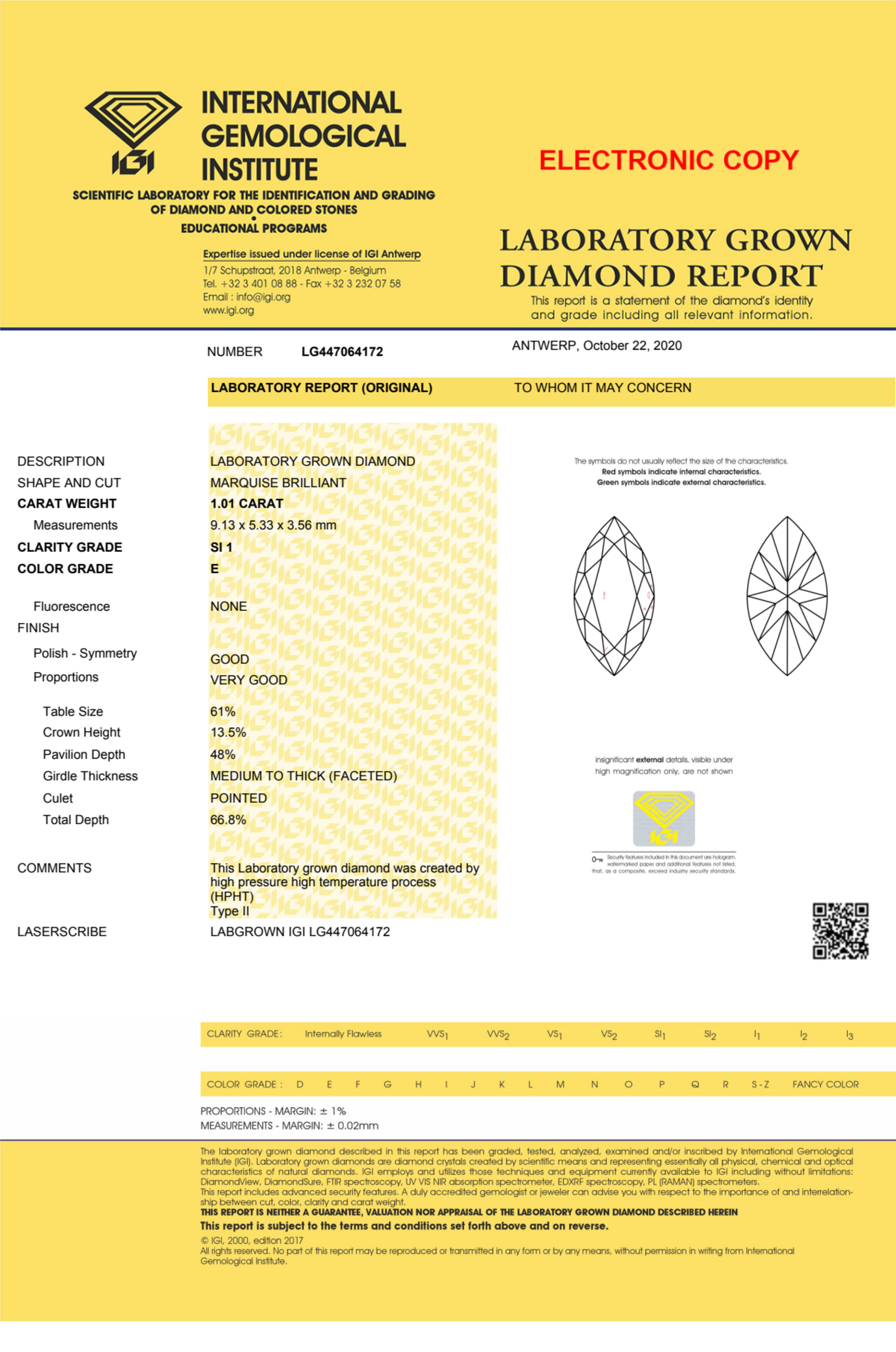 Your 1.01 carat Marquise lab diamond is graded E color (Colorless), and you can read more about E color diamonds here.