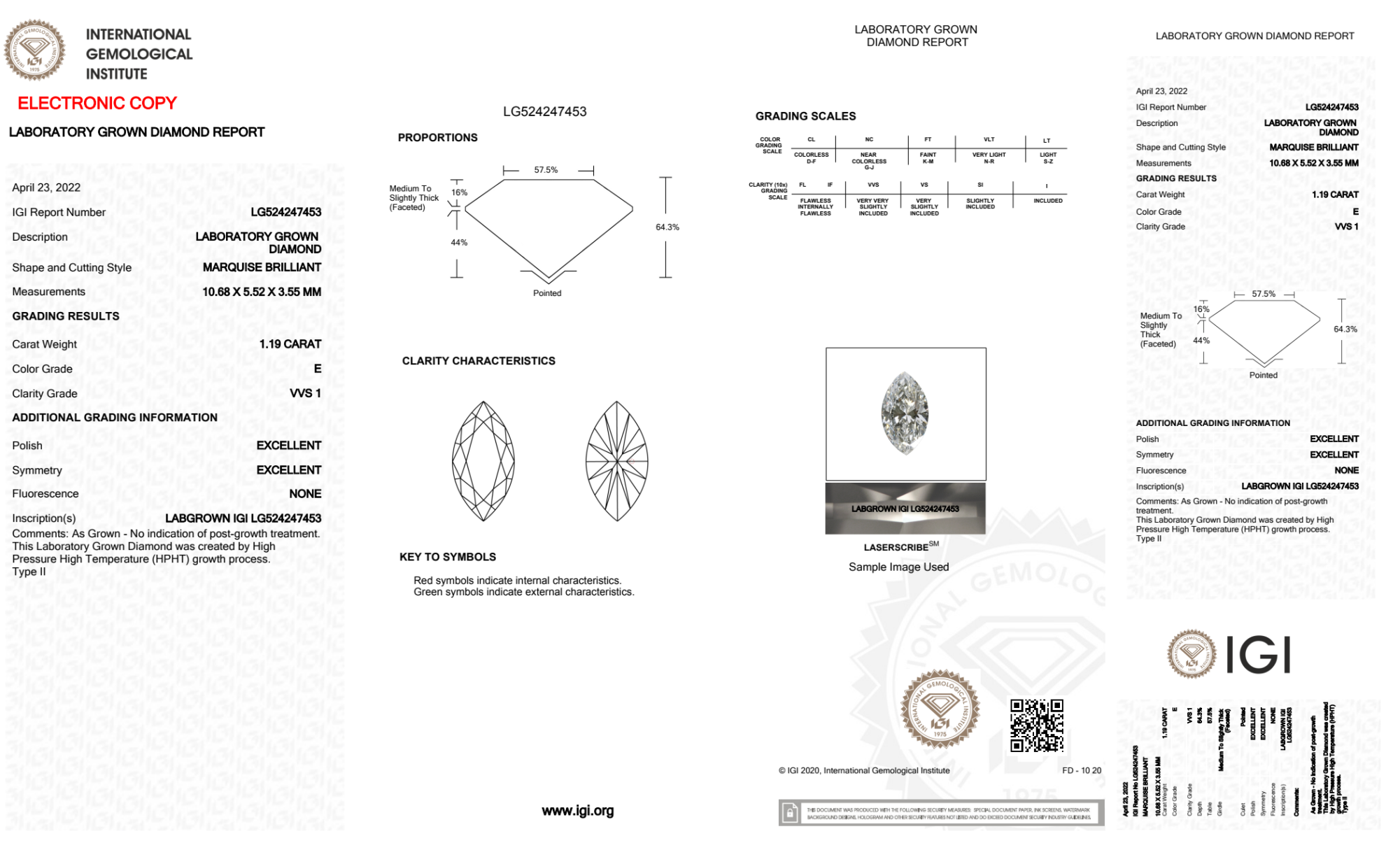 Your 1.19 carat Marquise lab diamond is graded E color (Colorless), and you can read more about E color diamonds here.