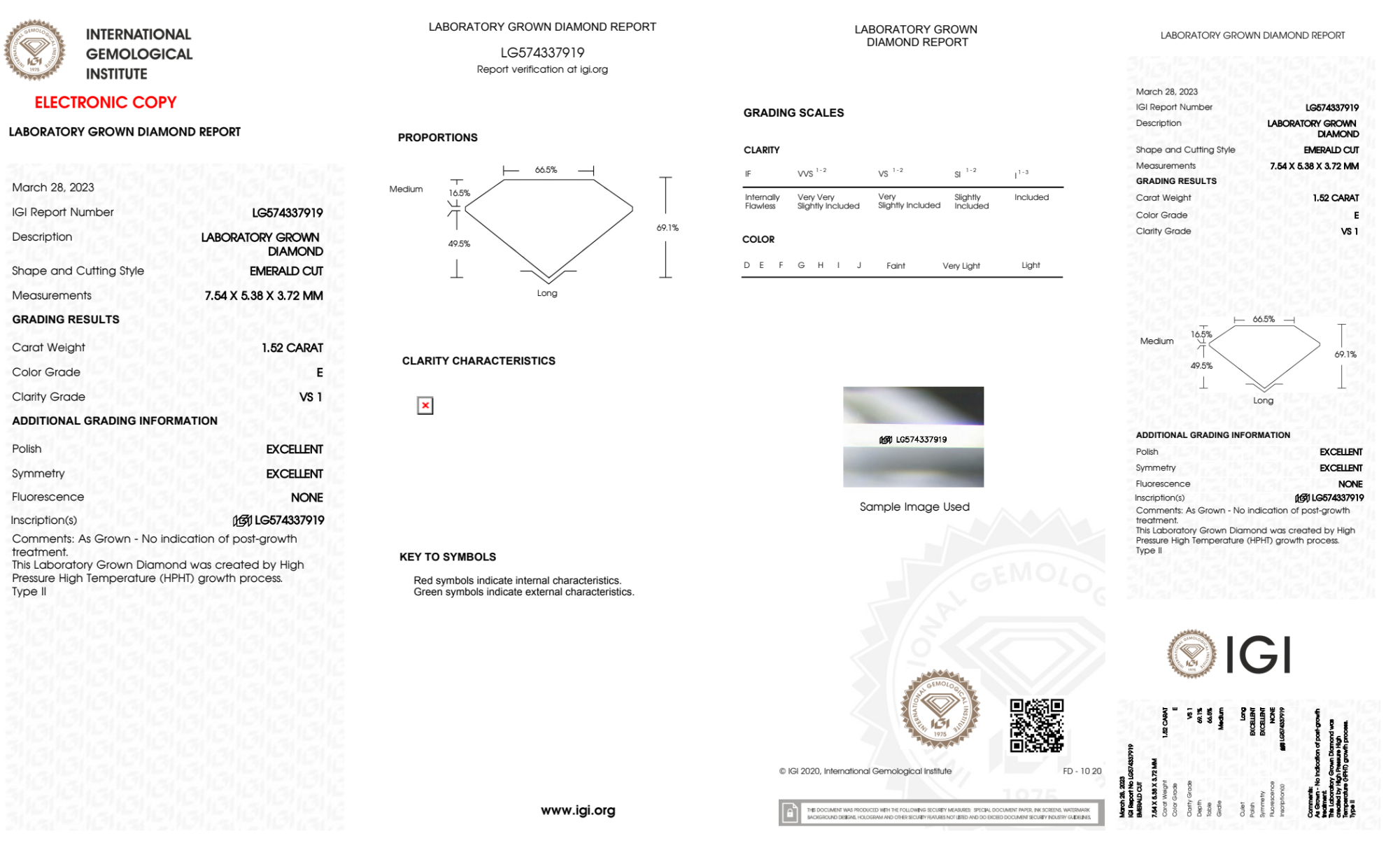 Your 1.52 carat Emerald lab diamond is graded VS1 clarity, which stands for Very Slightly Included 1. Read more about VS1 clarity diamonds here, or learn more about diamond clarity in general here.