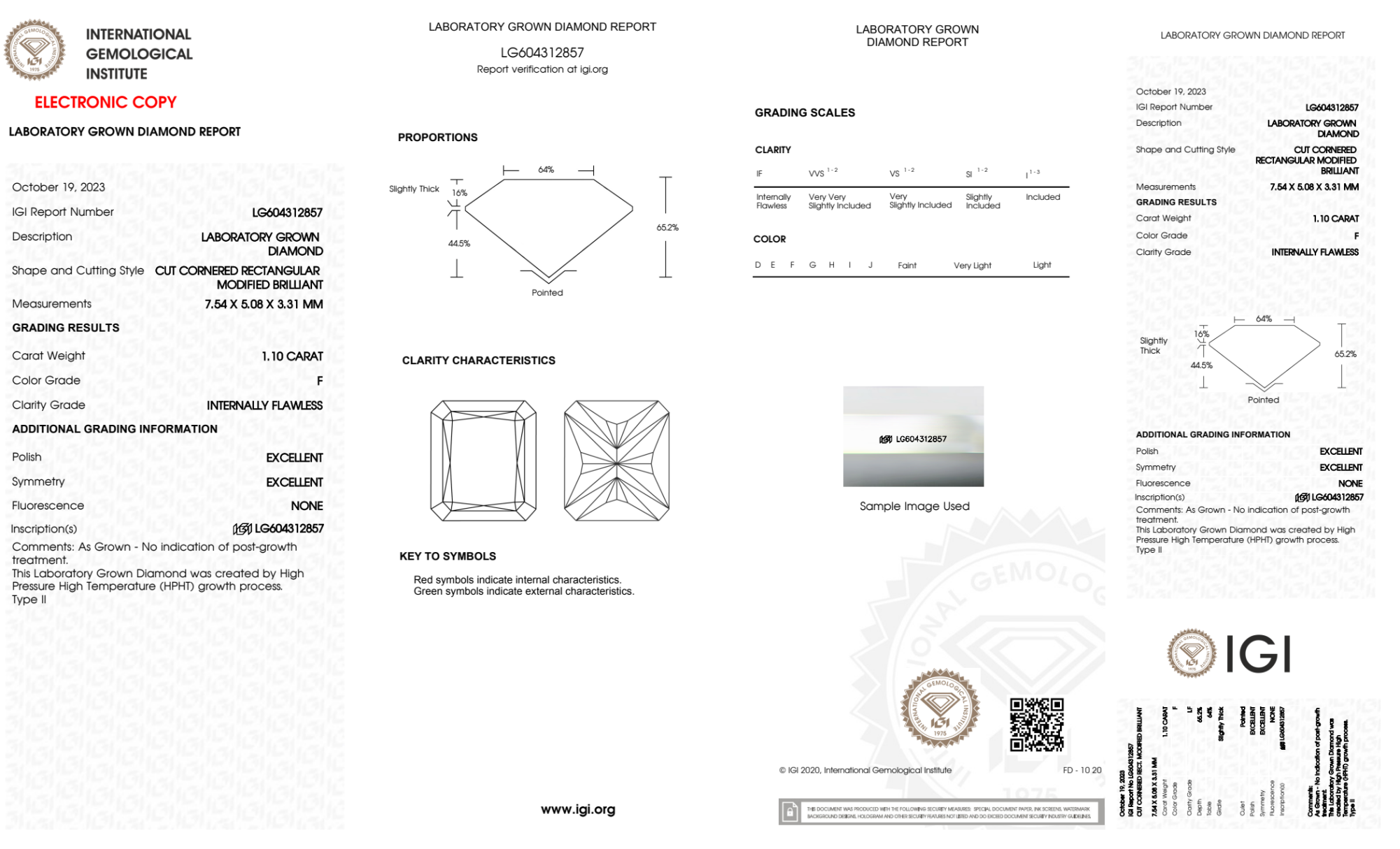 Your 1.10 carat Radiant lab diamond is graded IF clarity, which stands for Internally Flawless. Read more about IF clarity diamonds here, or learn more about diamond clarity in general here.