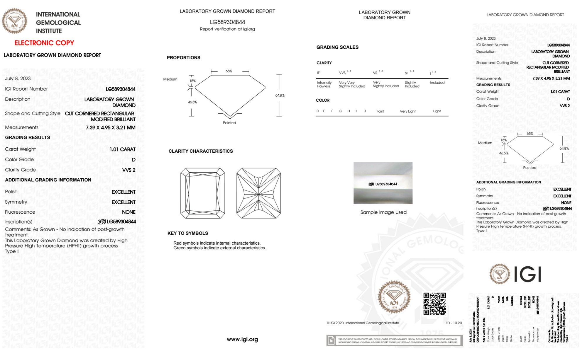 Your 1.01 carat Radiant lab diamond is graded D color (Colorless), and you can read more about D color diamonds here.