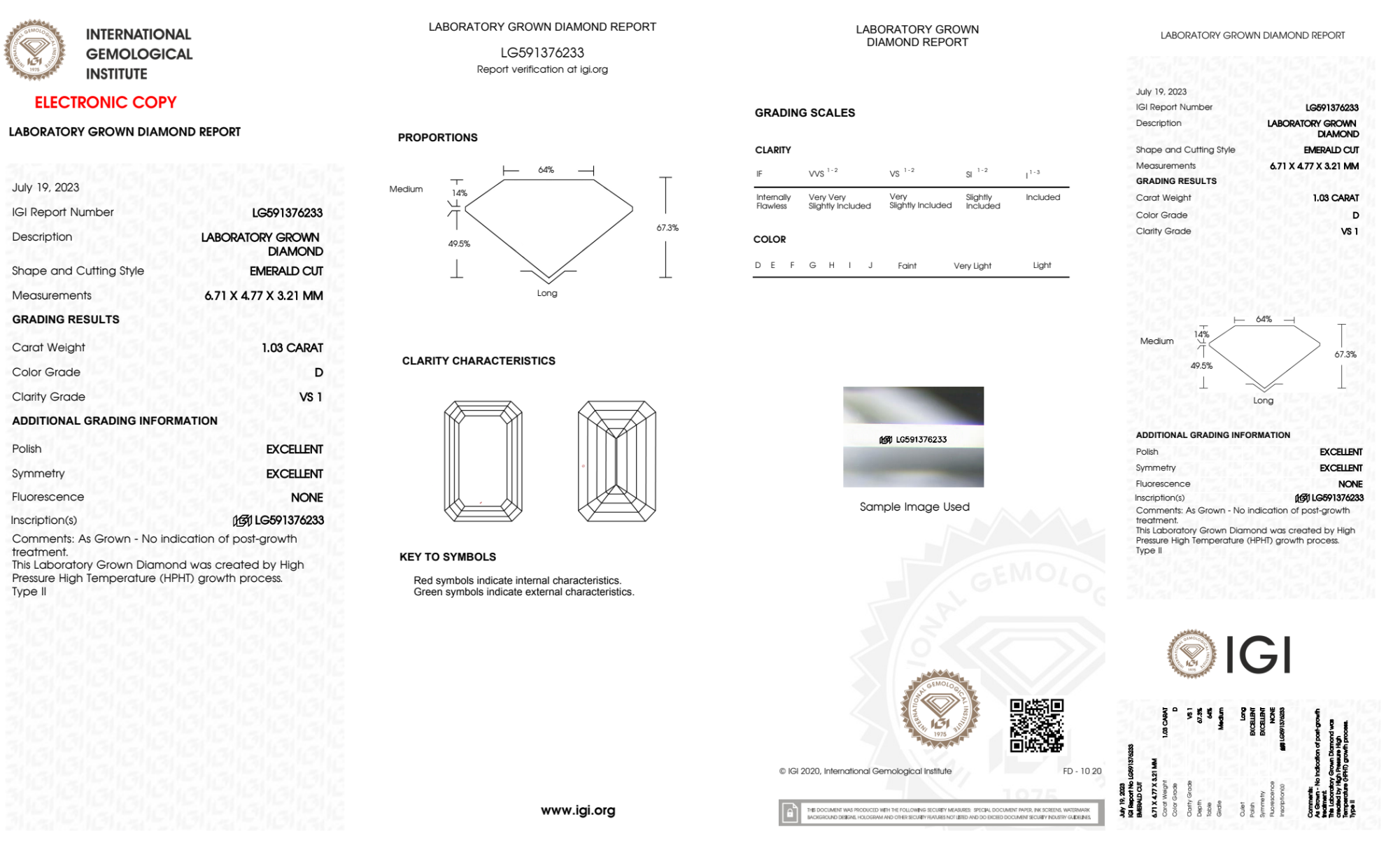 Your 1.03 carat Emerald lab diamond is graded D color (Colorless), and you can read more about D color diamonds here.