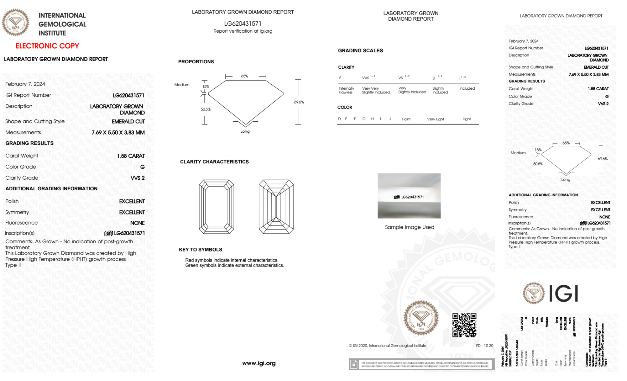Your 1.58 carat Emerald lab diamond is graded G color (Near Colorless), and you can read more about G color diamonds here.