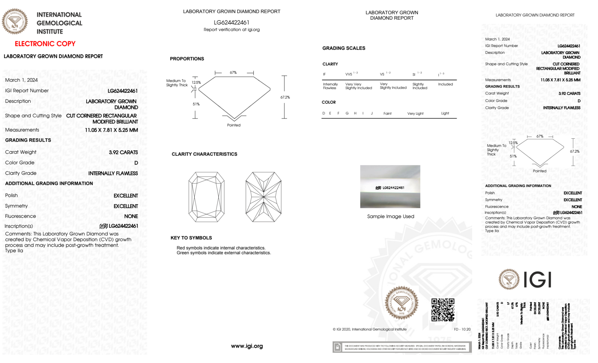 Your 3.92 carat Radiant lab diamond is graded IF clarity, which stands for Internally Flawless. Read more about IF clarity diamonds here, or learn more about diamond clarity in general here.