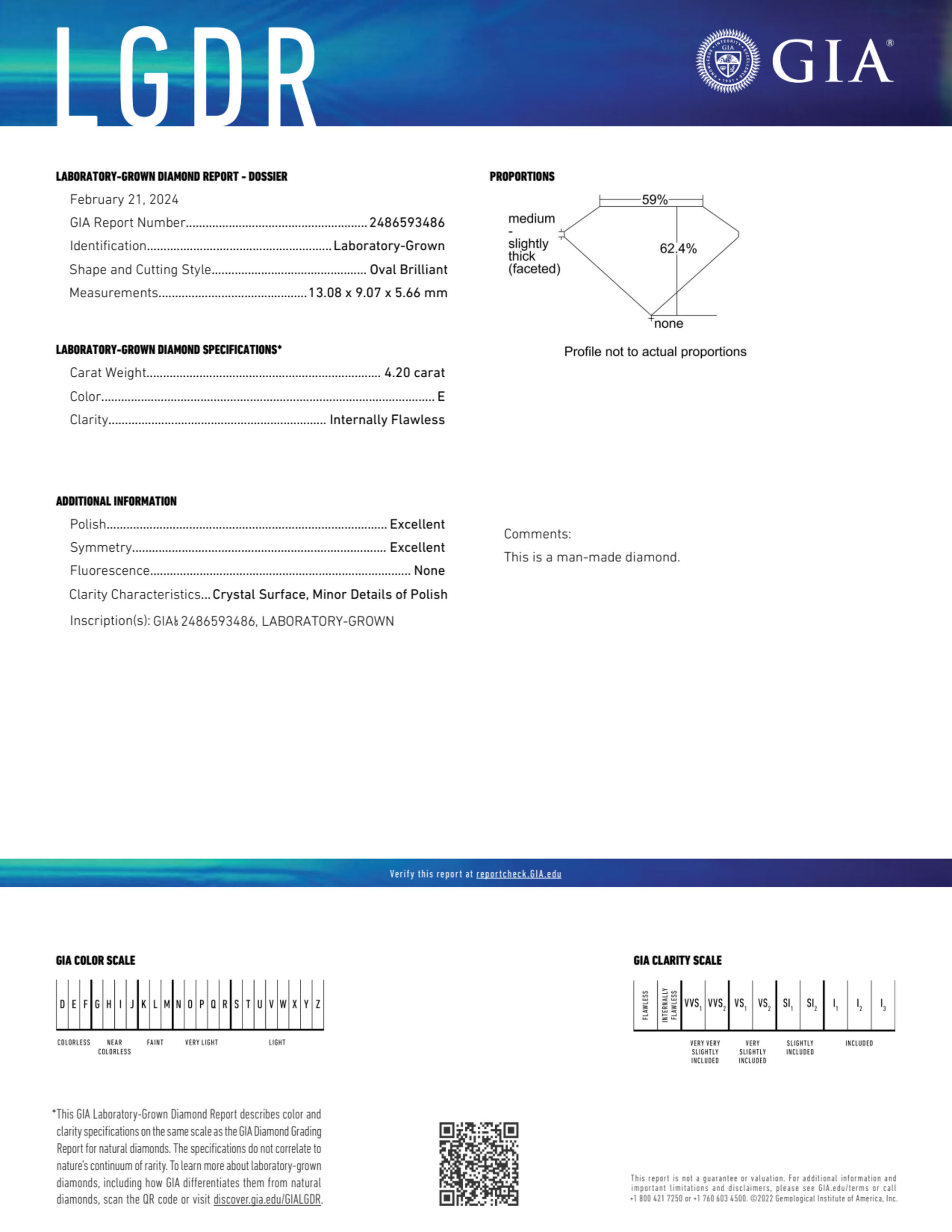 Your 4.20 carat Oval lab diamond is graded E color (Colorless), and you can read more about E color diamonds here.