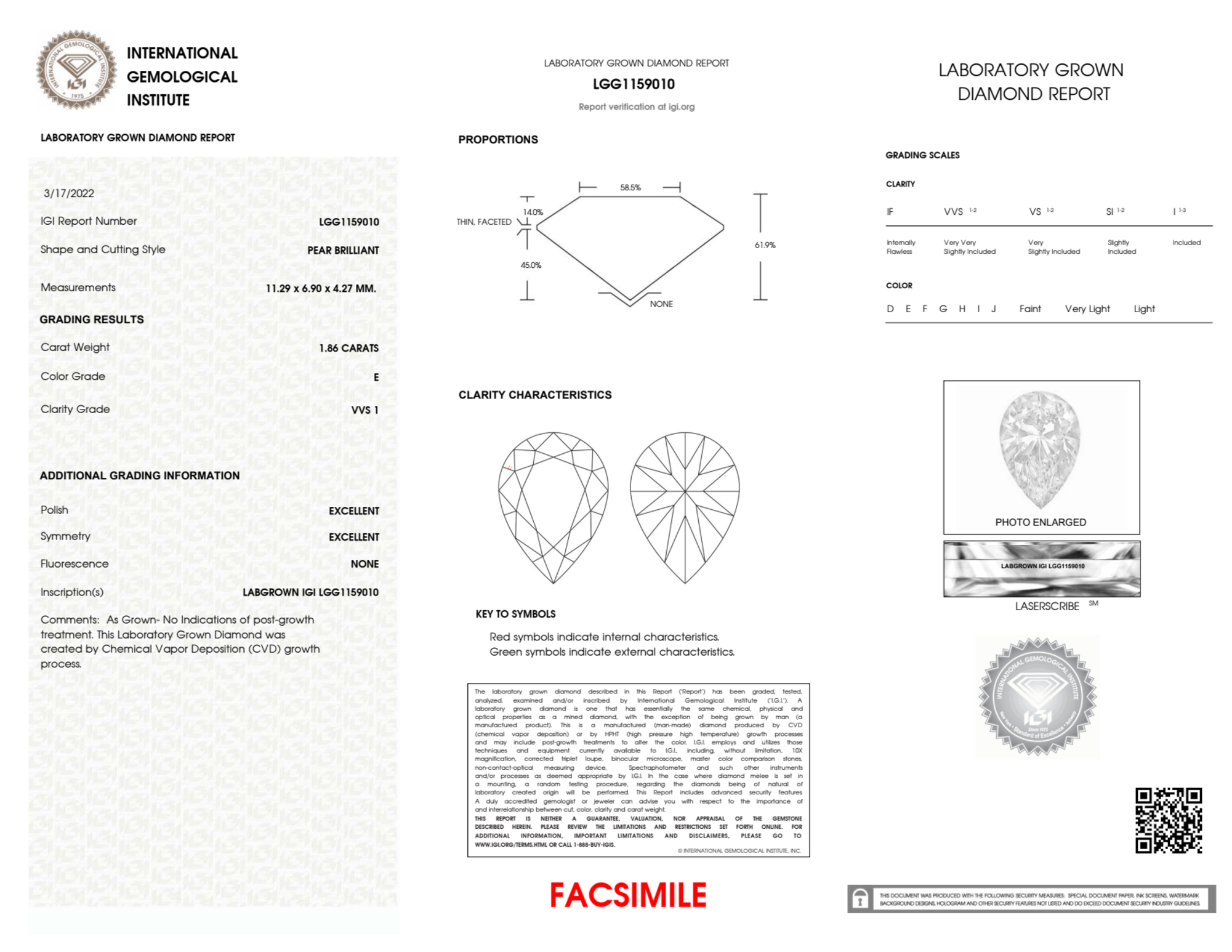 Your 1.86 carat Pear lab diamond is graded E color (Colorless), and you can read more about E color diamonds here.