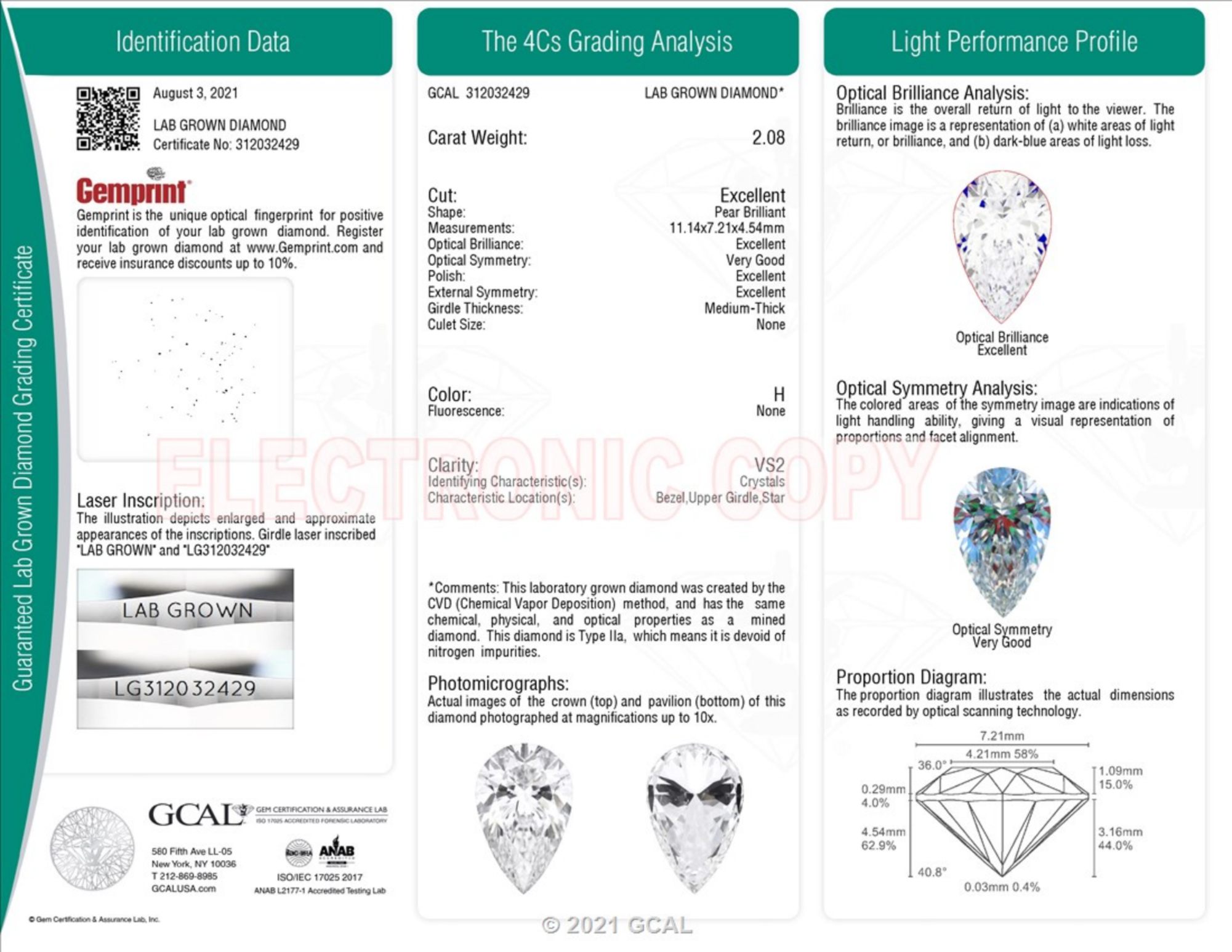 Your 2.08 carat Pear lab diamond is graded H color (Near Colorless), and you can read more about H color diamonds here.