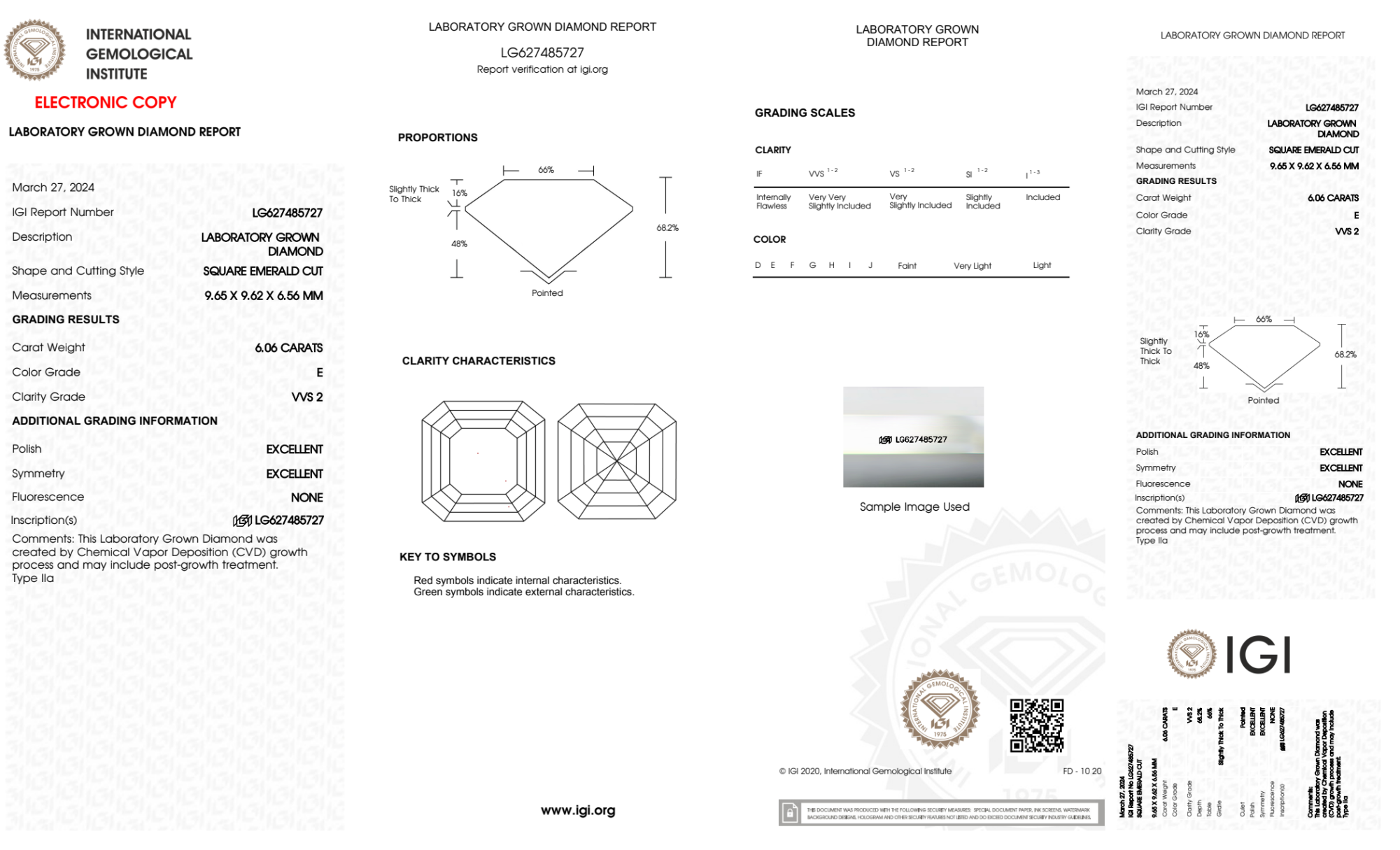 Your 6.06 carat Asscher lab diamond is graded E color (Colorless), and you can read more about E color diamonds here.