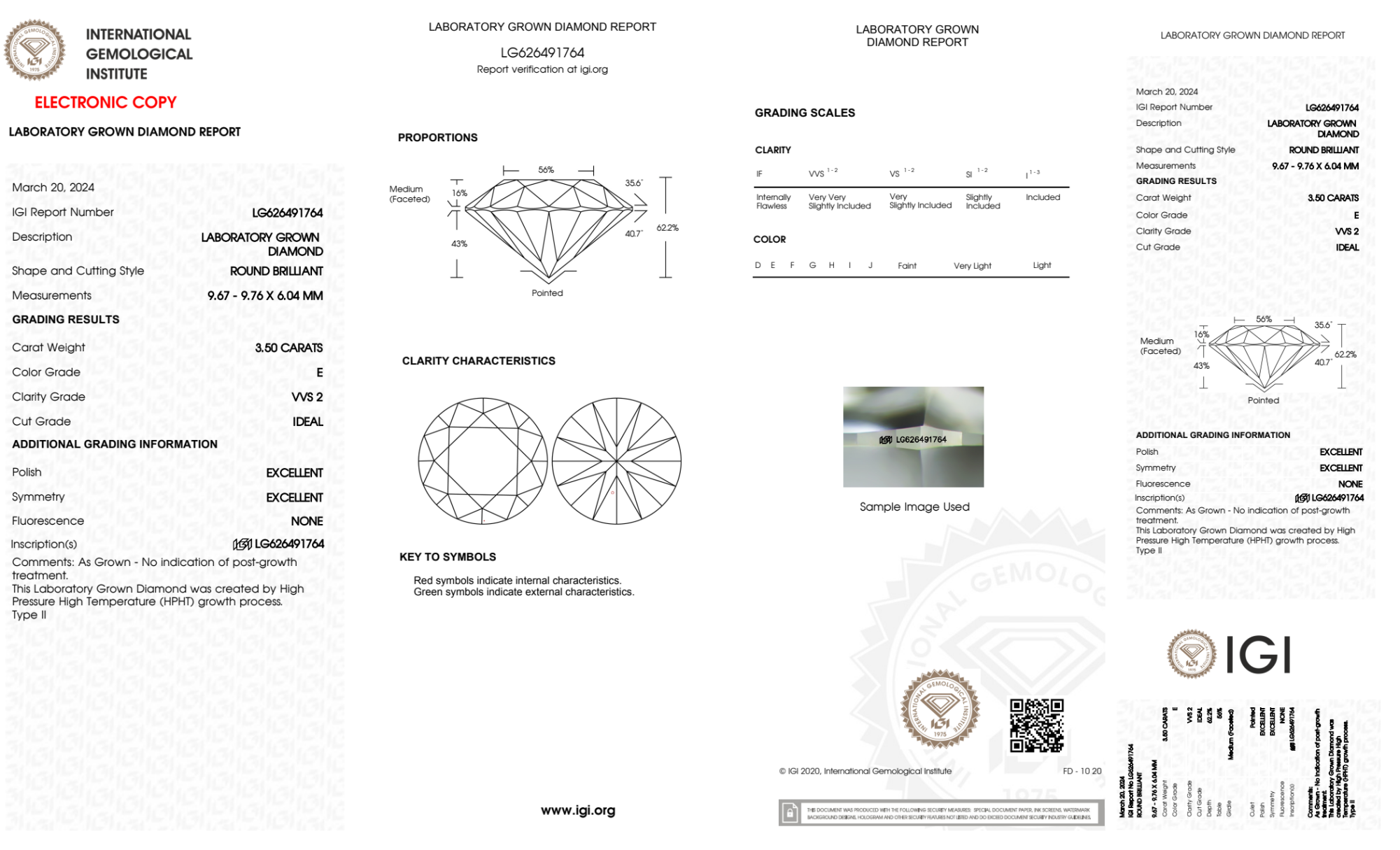 Your 3.50 carat Round lab diamond is graded E color (Colorless), and you can read more about E color diamonds here.