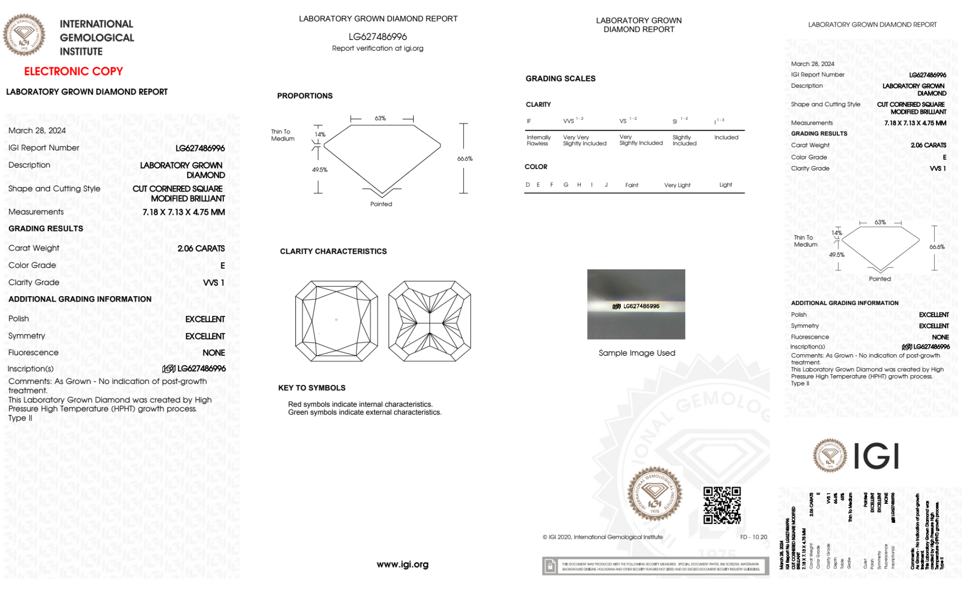 Your 2.06 carat Radiant lab diamond is graded E color (Colorless), and you can read more about E color diamonds here.