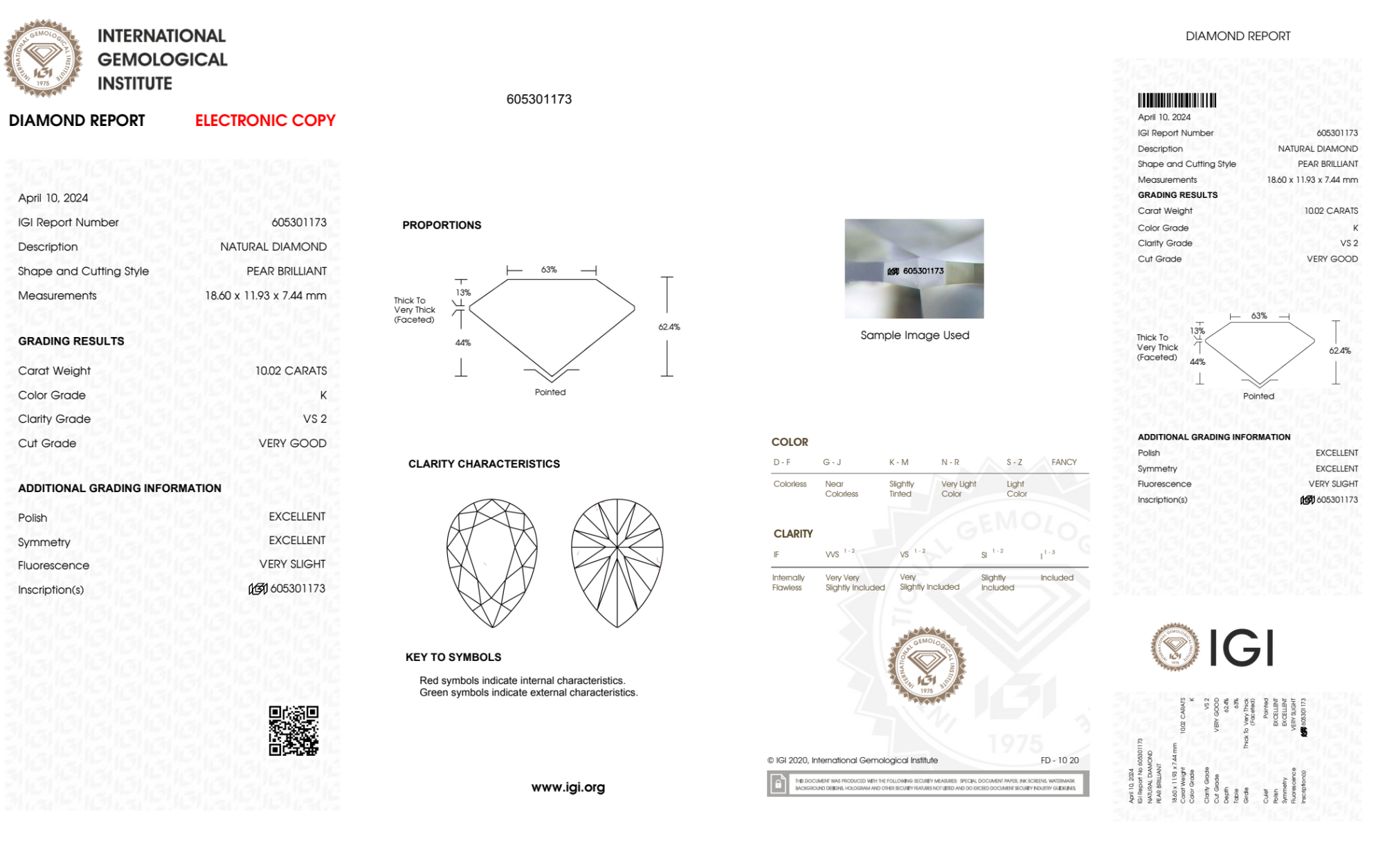 Your 10.02 carat Pear natural diamond is graded K color (Faint Color), and you can read more about K color diamonds here.