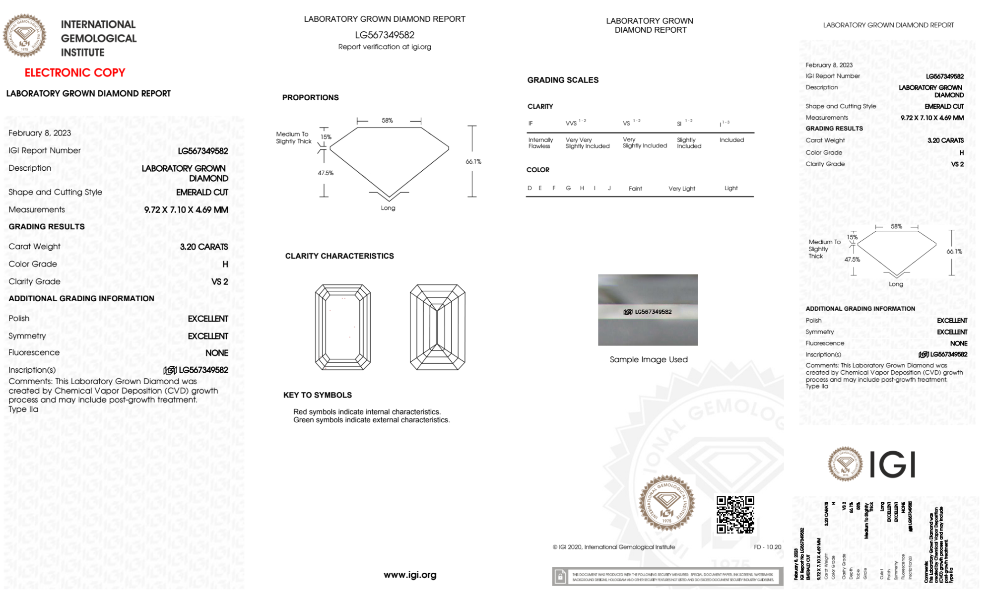 Your 3.20 carat Emerald lab diamond is graded VS2 clarity, which stands for Very Slightly Included 2. Read more about VS2 clarity diamonds here, or learn more about diamond clarity in general here.
