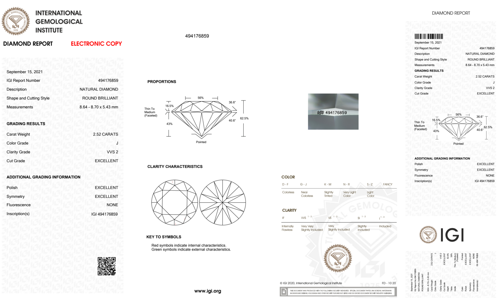 Your 2.51 carat Round natural diamond is graded J color (Near Colorless), and you can read more about J color diamonds here.