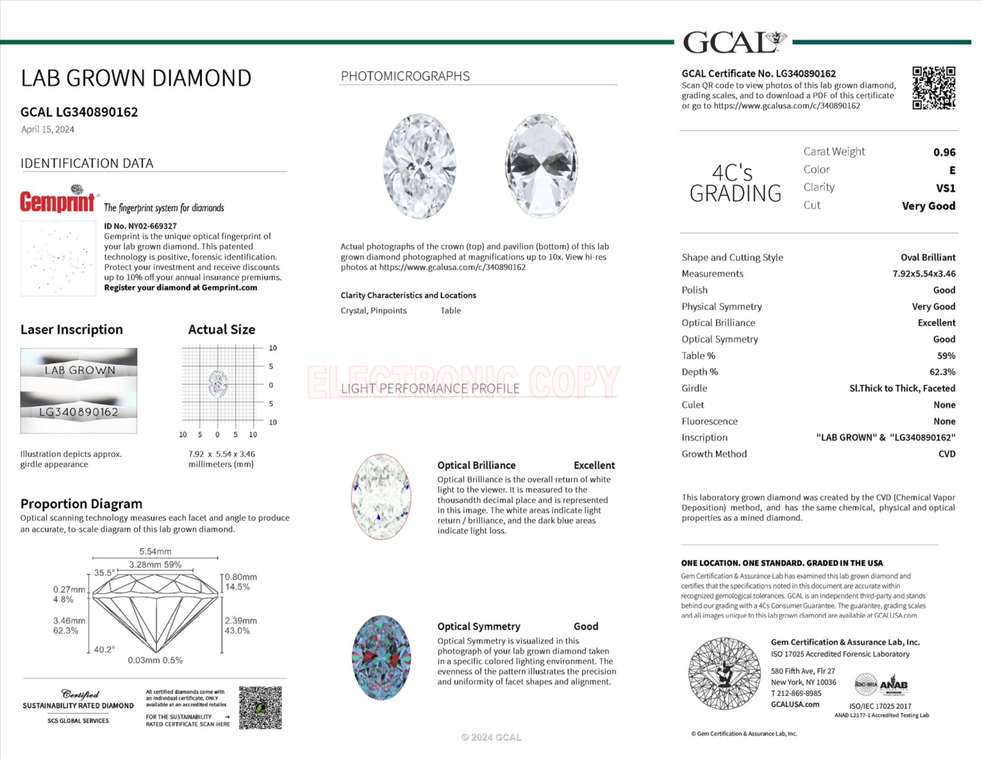 Your 0.96 carat Oval lab diamond is graded E color (Colorless), and you can read more about E color diamonds here.