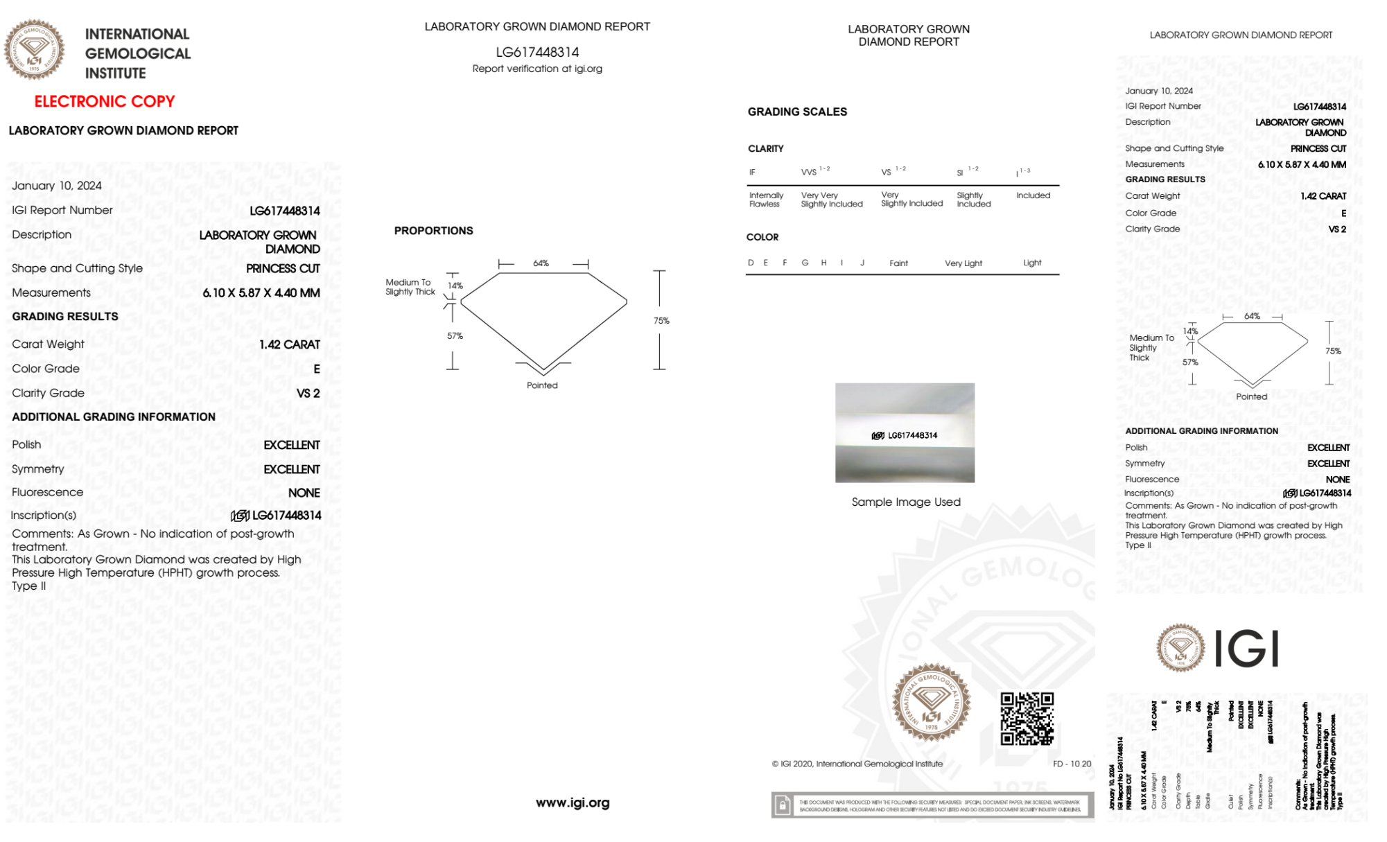 Your 1.42 carat Princess lab diamond is graded E color (Colorless), and you can read more about E color diamonds here.