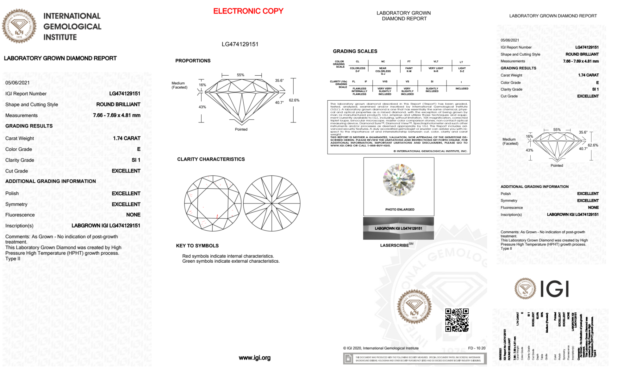 Your 1.74 carat Round lab diamond is graded E color (Colorless), and you can read more about E color diamonds here.