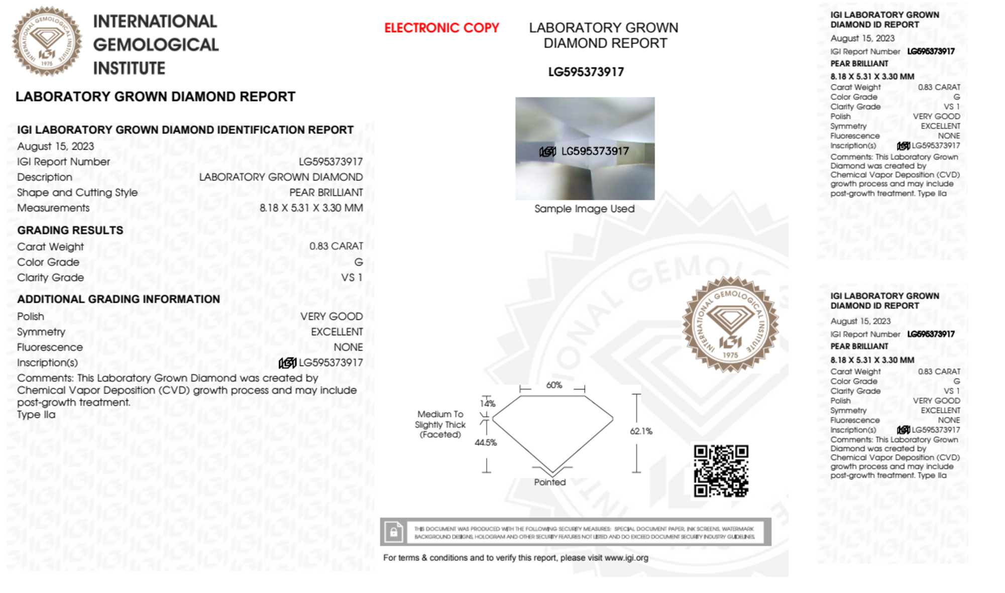 Your 0.83 carat Pear lab diamond is graded G color (Near Colorless), and you can read more about G color diamonds here.
