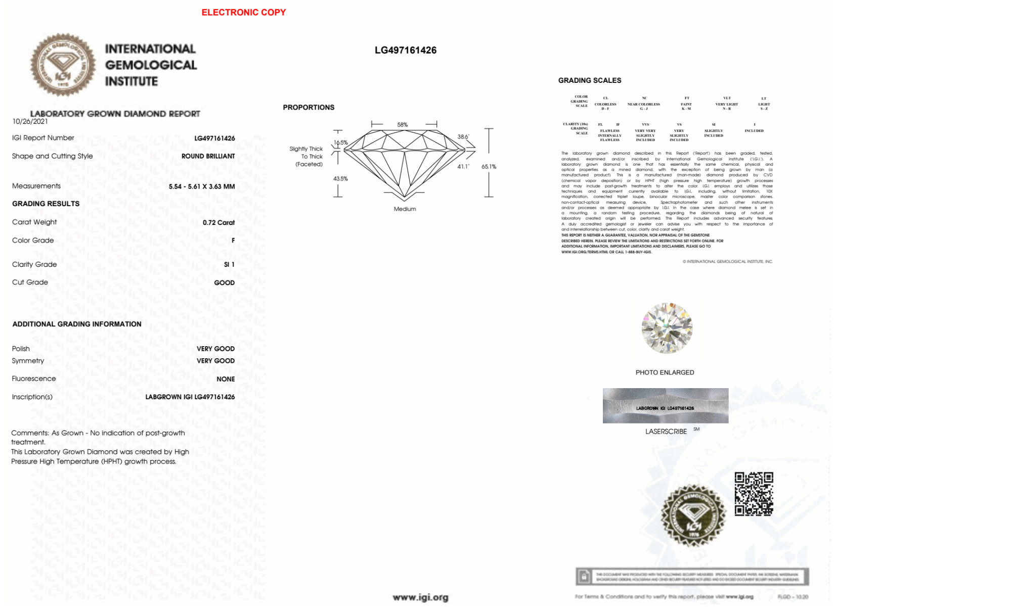 Your 0.72 carat Round lab diamond is graded F color (Colorless), and you can read more about F color diamonds here.
