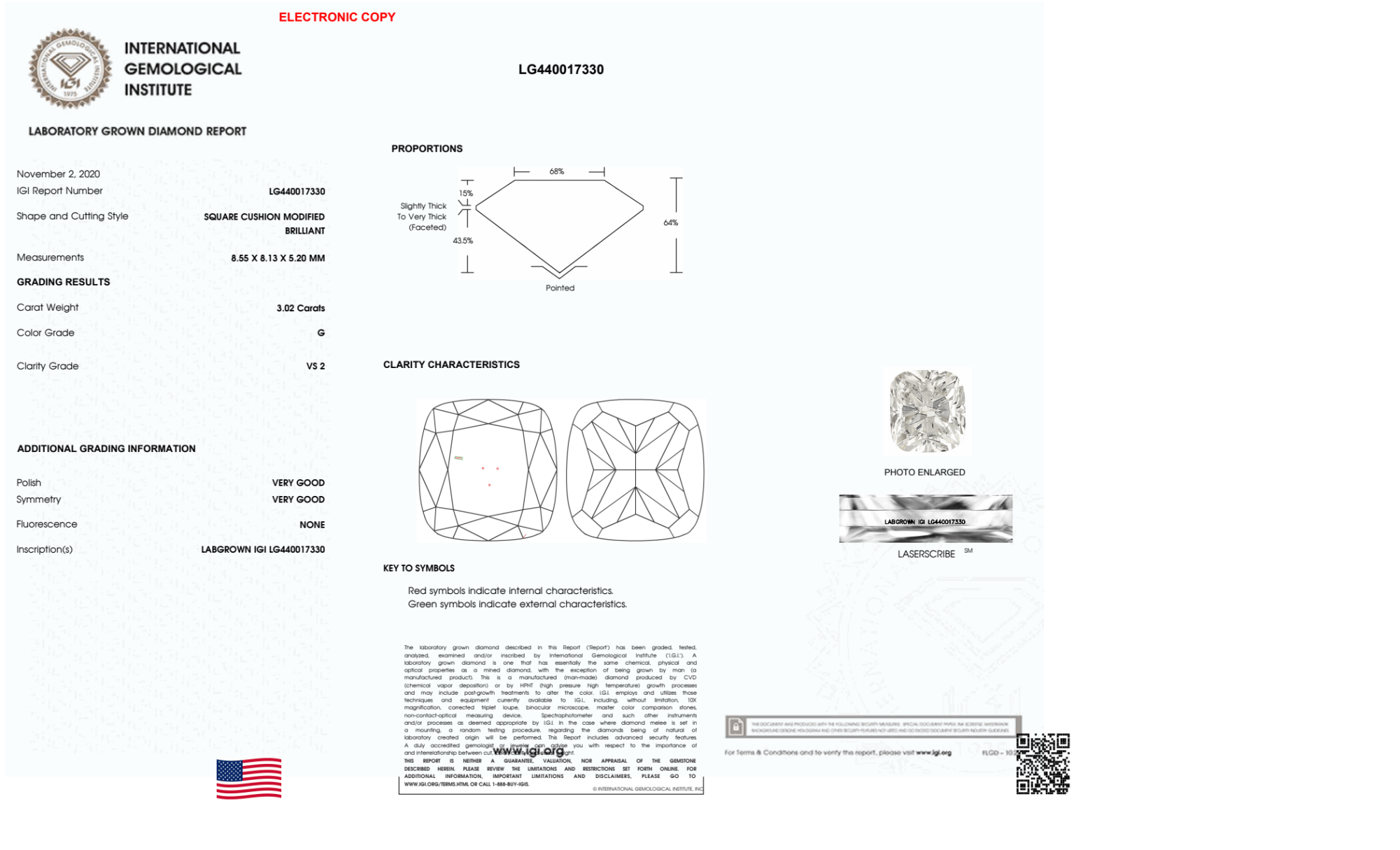 Your 3.02 carat Cushion lab diamond is graded G color (Near Colorless), and you can read more about G color diamonds here.