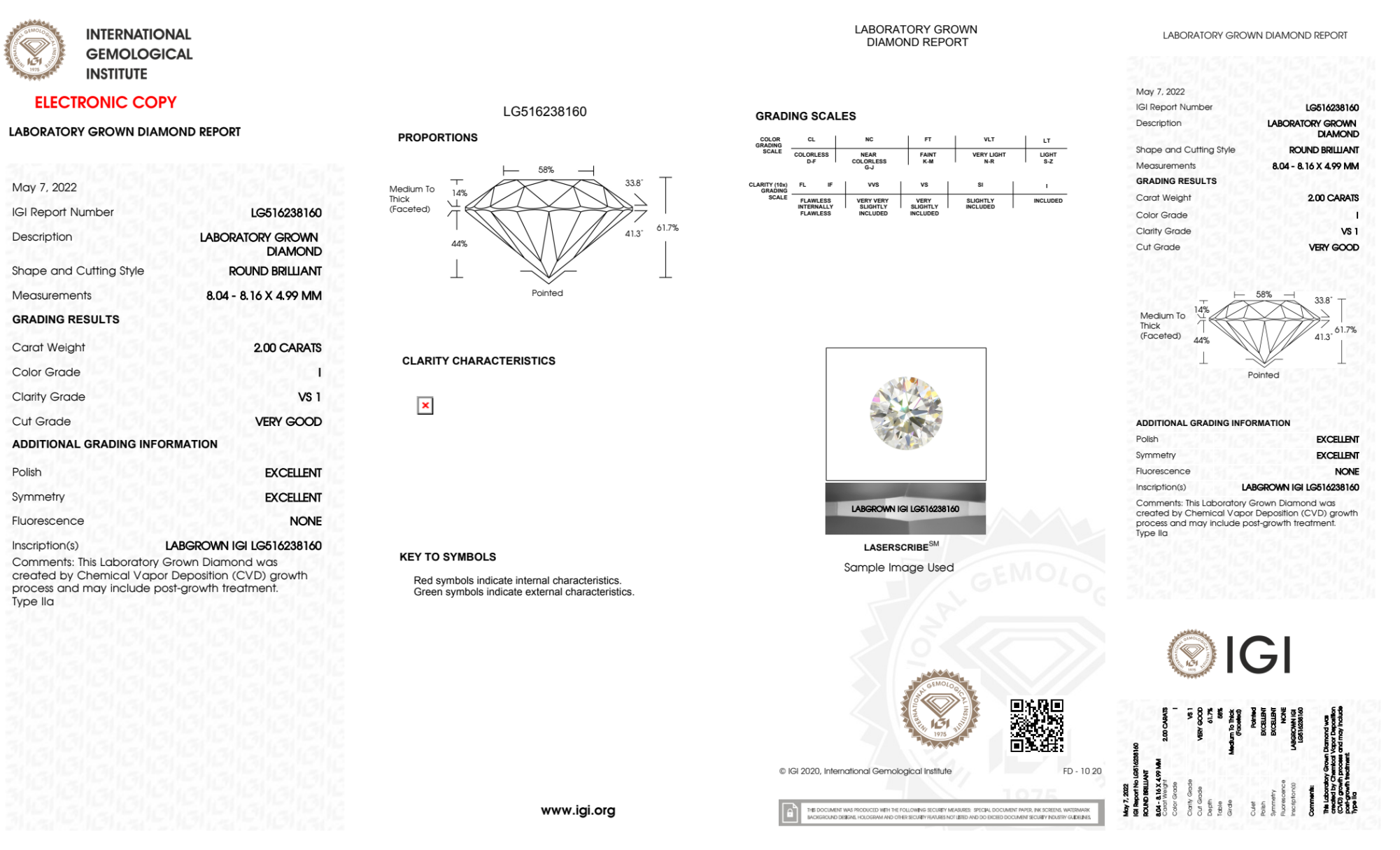 Your 2.00 carat Round lab diamond is graded I color (Near Colorless), and you can read more about I color diamonds here.