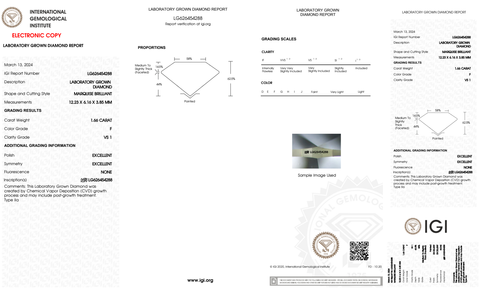 Your 1.66 carat Marquise lab diamond is graded F color (Colorless), and you can read more about F color diamonds here.