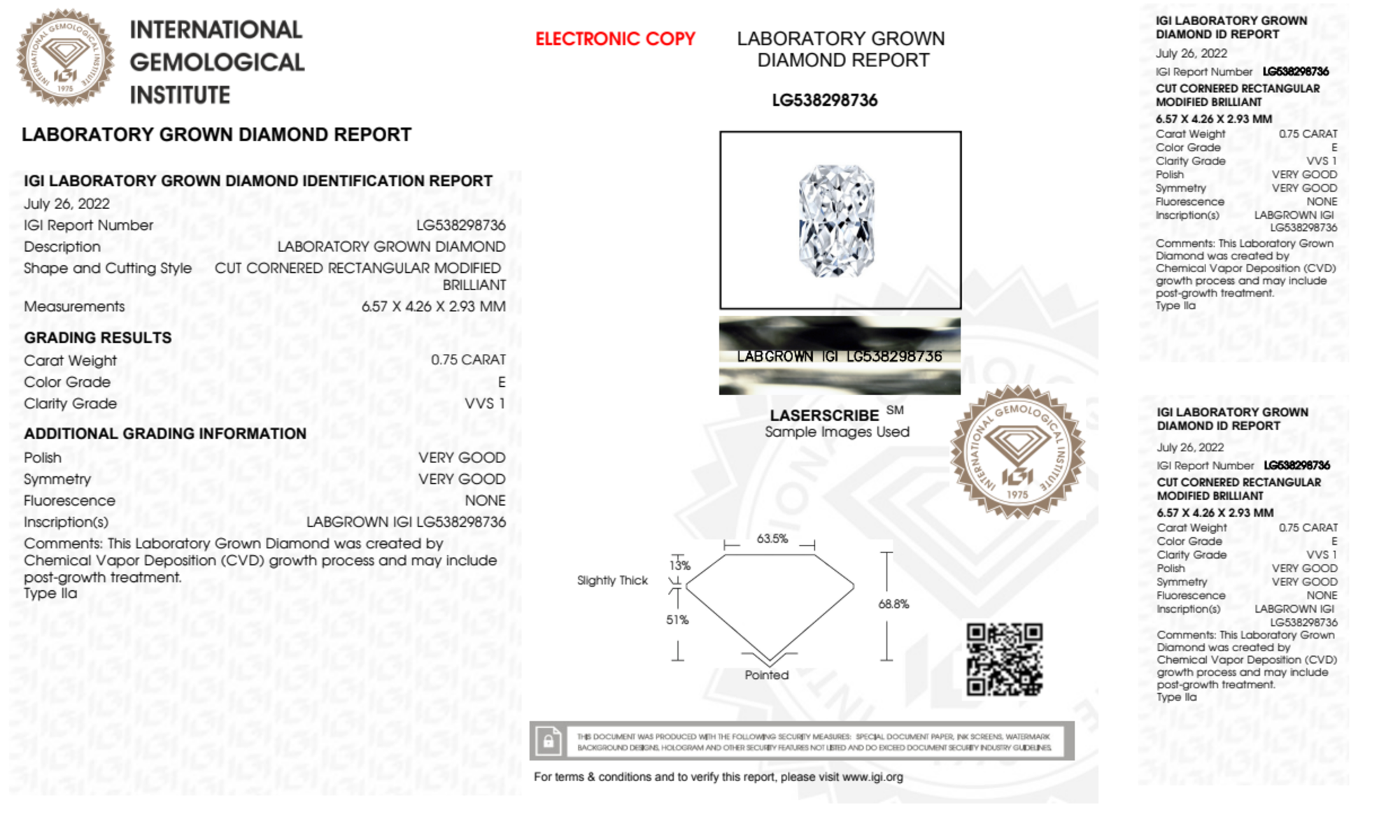 Your 0.75 carat Radiant lab diamond is graded E color (Colorless), and you can read more about E color diamonds here.