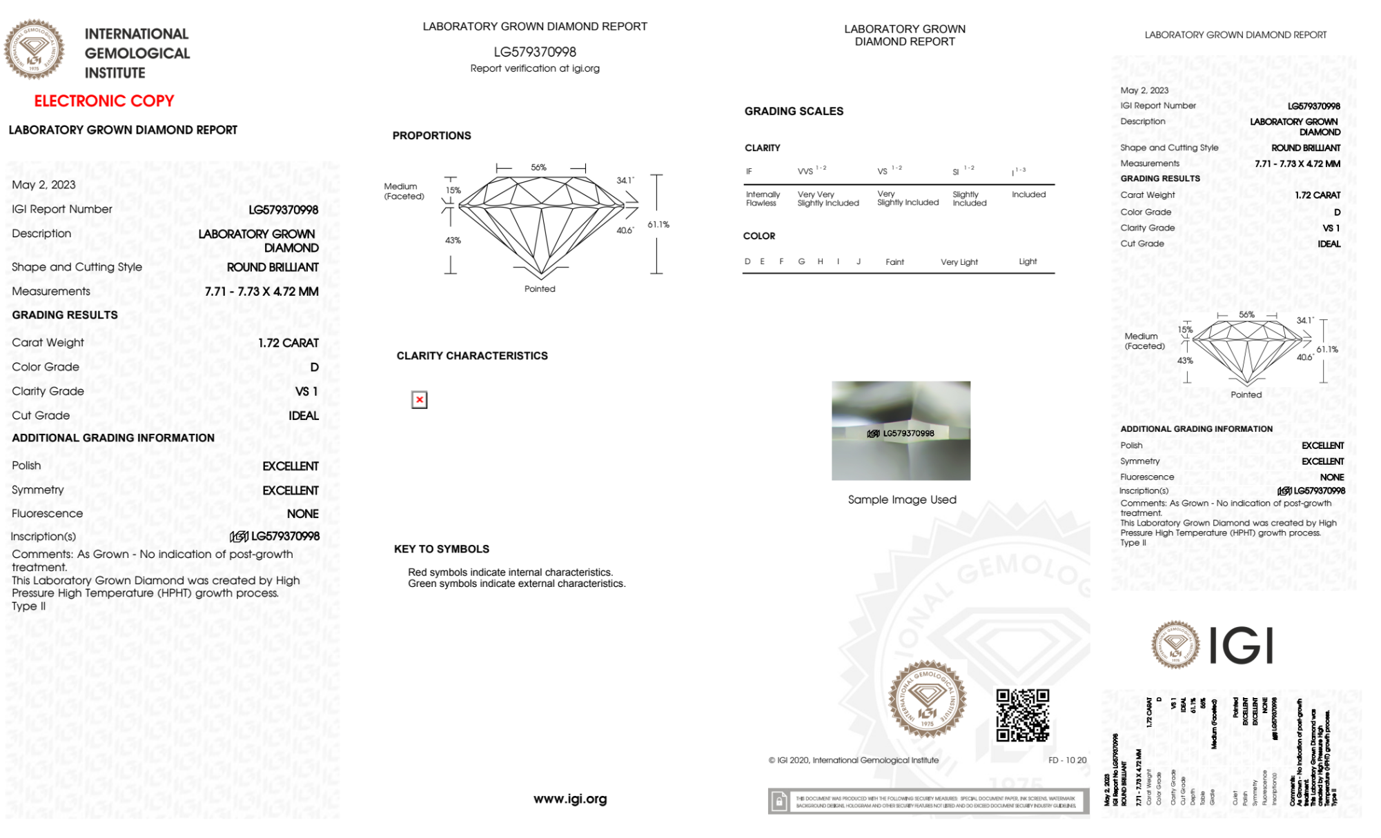 Your 1.72 carat Round lab diamond is graded D color (Colorless), and you can read more about D color diamonds here.