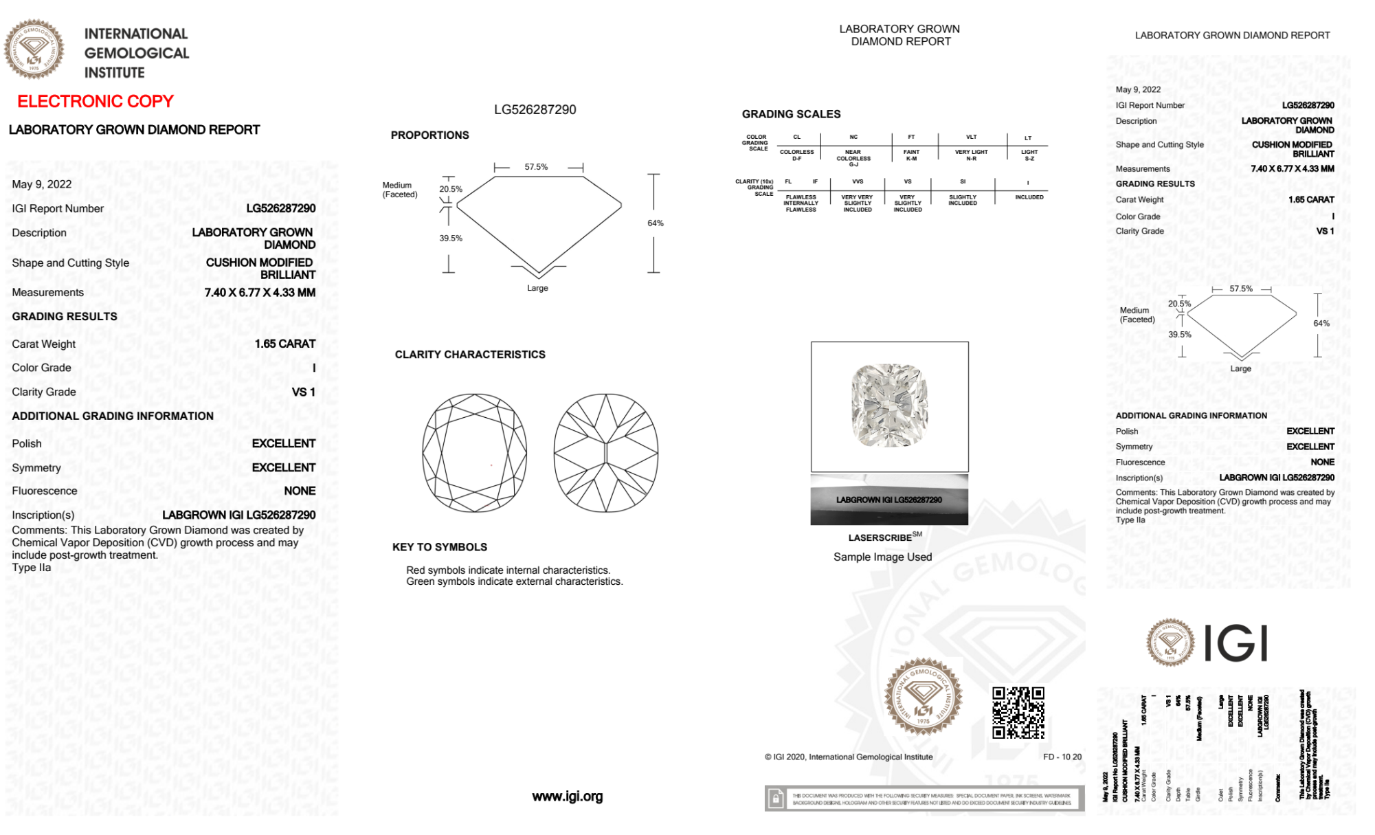 Your 1.65 carat Cushion lab diamond is graded VS1 clarity, which stands for Very Slightly Included 1. Read more about VS1 clarity diamonds here, or learn more about diamond clarity in general here.