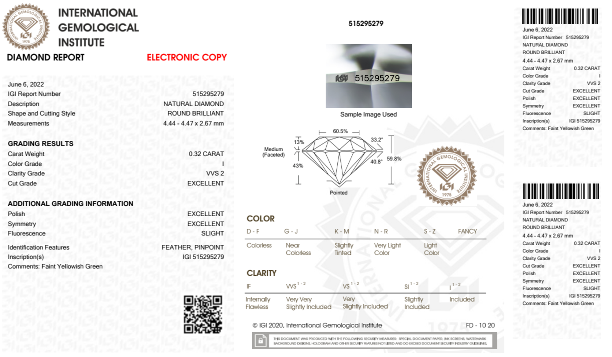 Your 0.32 carat Round natural diamond is graded I color (Near Colorless), and you can read more about I color diamonds here.