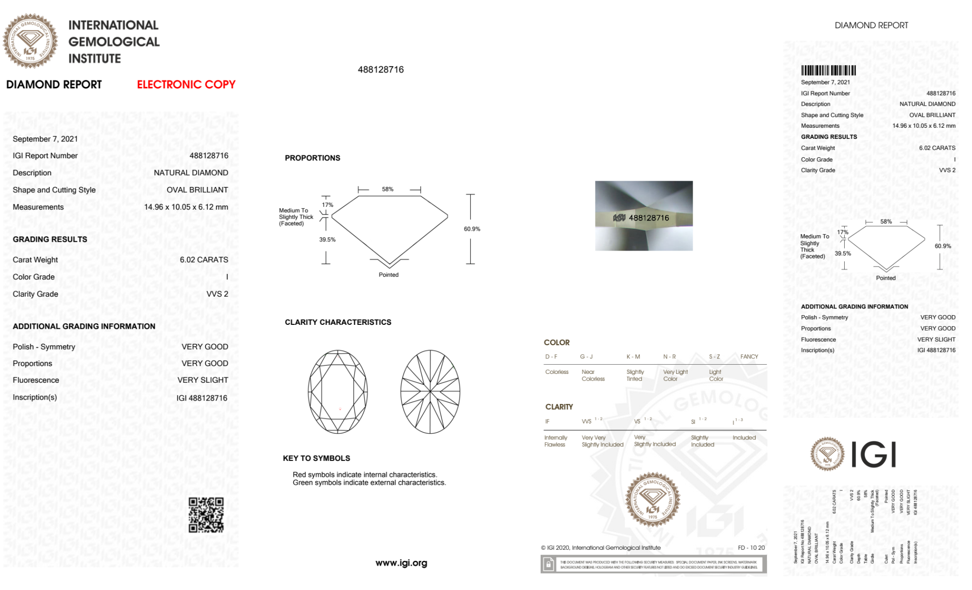 Your 6.01 carat Oval natural diamond is graded I color (Near Colorless), and you can read more about I color diamonds here.