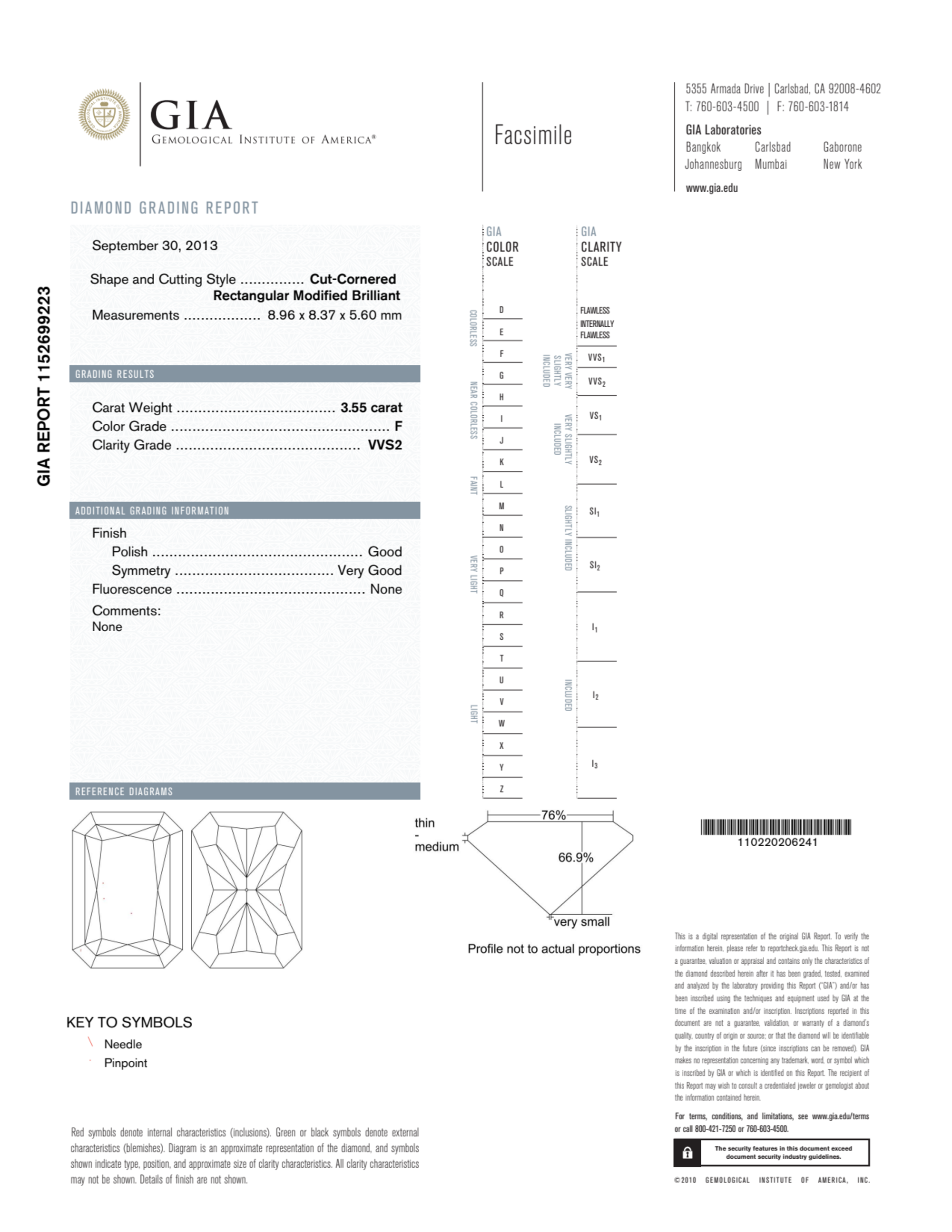 Your 3.55 carat Radiant natural diamond is graded VVS2 clarity, which stands for Very Very Slightly Included 2. Read more about VVS2 clarity diamonds here, or learn more about diamond clarity in general here.