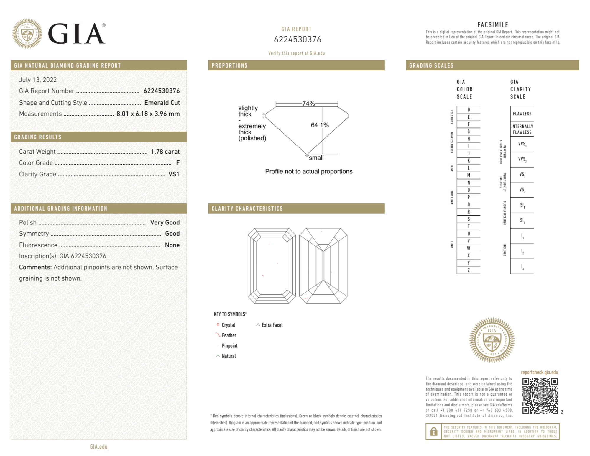 Your 1.78 carat Emerald natural diamond is graded F color (Colorless), and you can read more about F color diamonds here.
