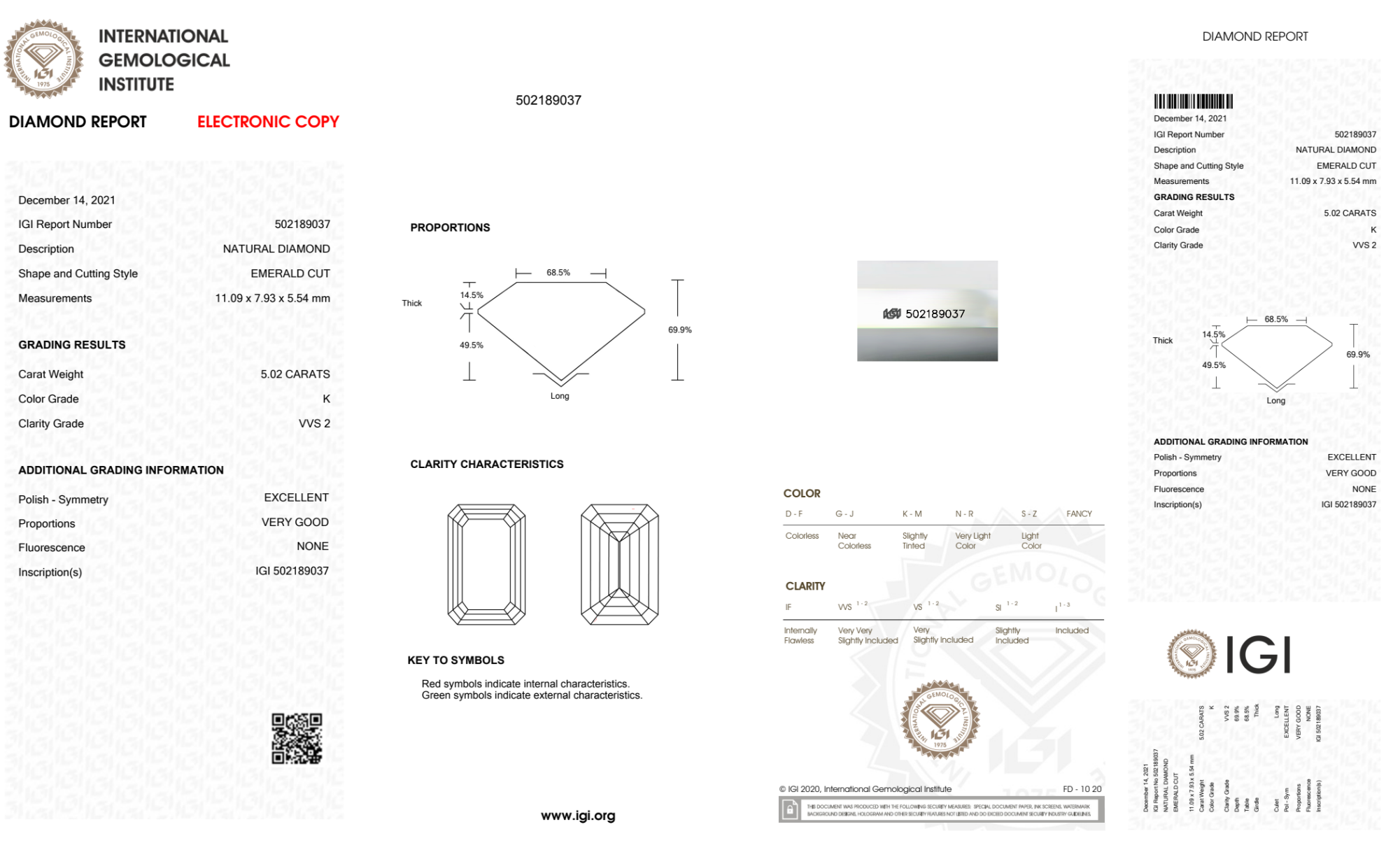 Your 5.02 carat Emerald natural diamond is graded VVS2 clarity, which stands for Very Very Slightly Included 2. Read more about VVS2 clarity diamonds here, or learn more about diamond clarity in general here.