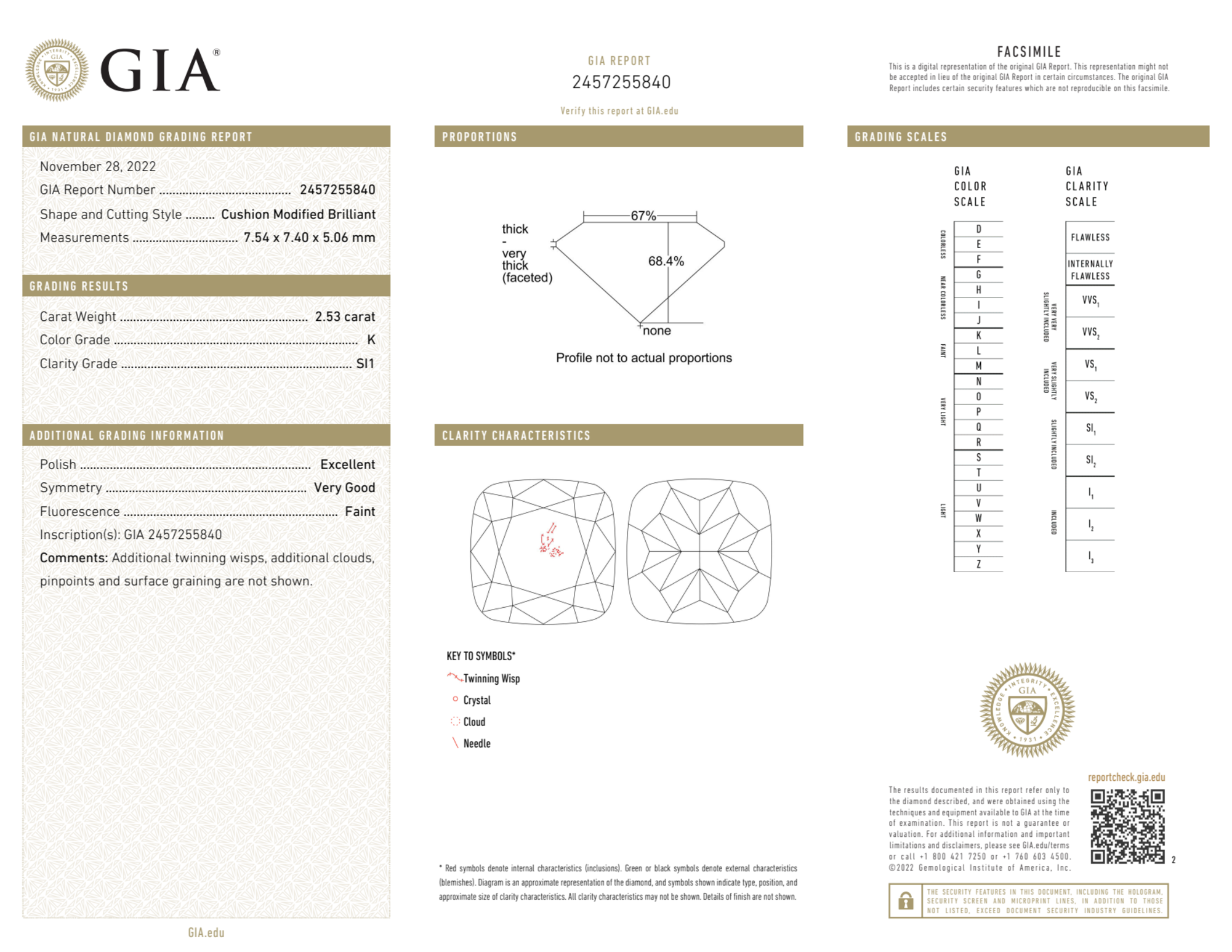 Your 2.53 carat Cushion natural diamond is graded K color (Faint Color), and you can read more about K color diamonds here.